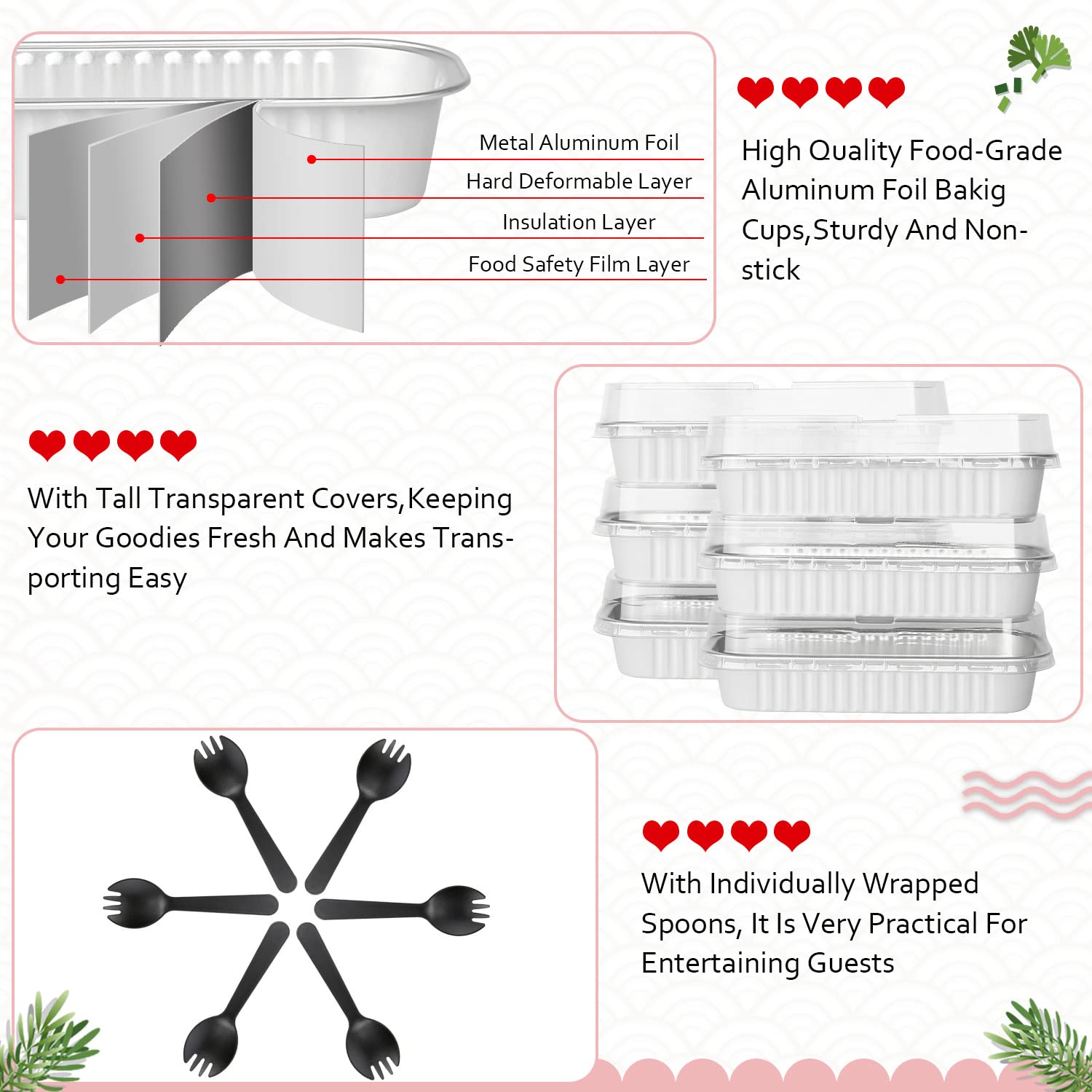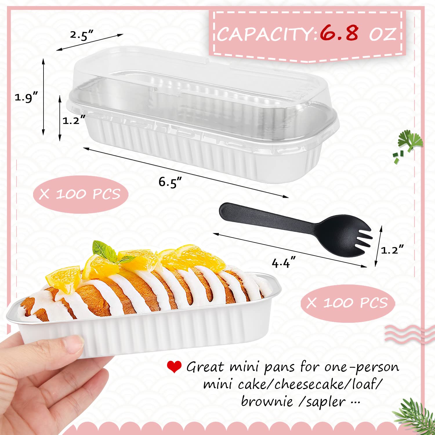 - 【Pack of 100 Sets】 - Including 100pcs mini cake pans with 100 clear lids,and 100 individually wrapped spoons.The mini loaf pan size:6.5”x2.5”x1.2”,the dome lids 0.8” high.Abundant small cake pans with lids are great for bake shops,big parties.