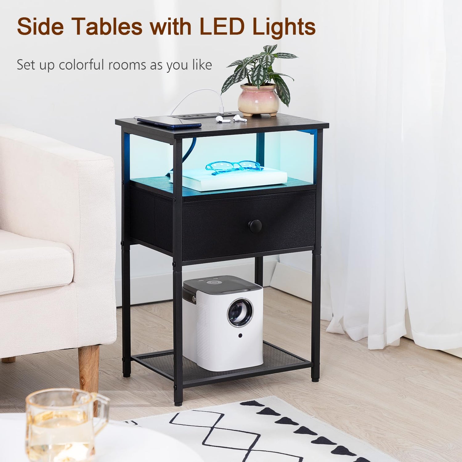 LOAKEKEL Night Stand Set 2, LED Nightstand with Charging Station, End Tables with Fabric Drawer for Small Spaces, Bedside Table with Storage Shelf for Bedroom, Black, HETS01BK