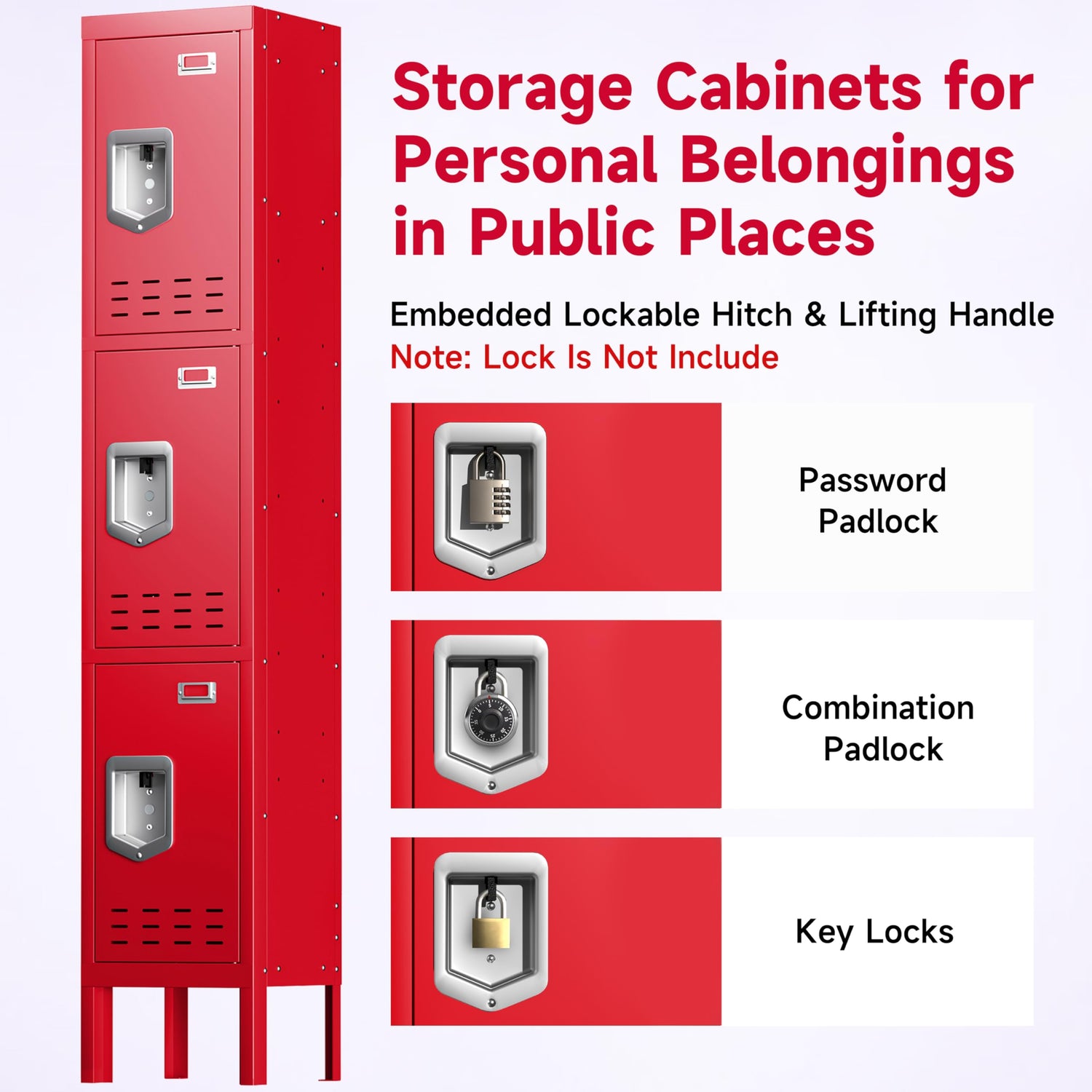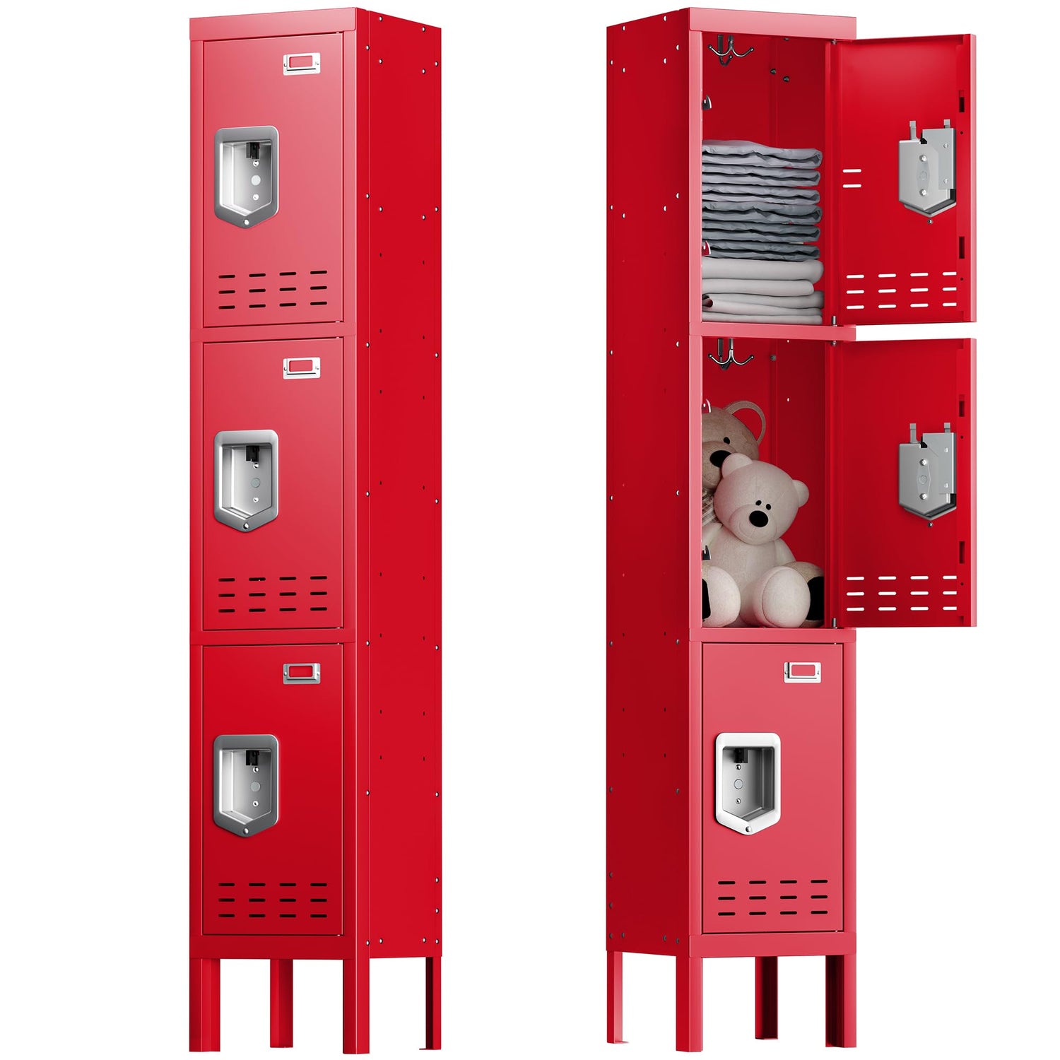 Locker Metal Storage Cabinet, Steel Office Storage Lockable Lockers for Employees Kids School Gym Home Garage Locker with Mirror & Hooks (3 Doors, Red)
