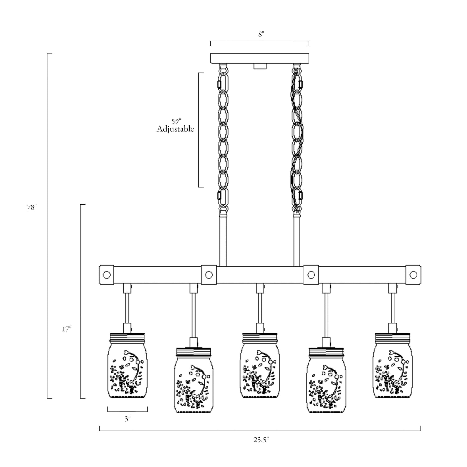 - [PERFECT PROPORTIONS] The ideal dimension of the famrhouse chandelier is 25.5" L x 3" W x 17" H, with a rectangular canopy measuring 8" L x 5.5" W x 1" H. Compatible with most ceiling types, the adjustable 59" chains provide the flexibility to easily adjust the height. These proportions ensure the chandelier harmoniously fits various spaces.