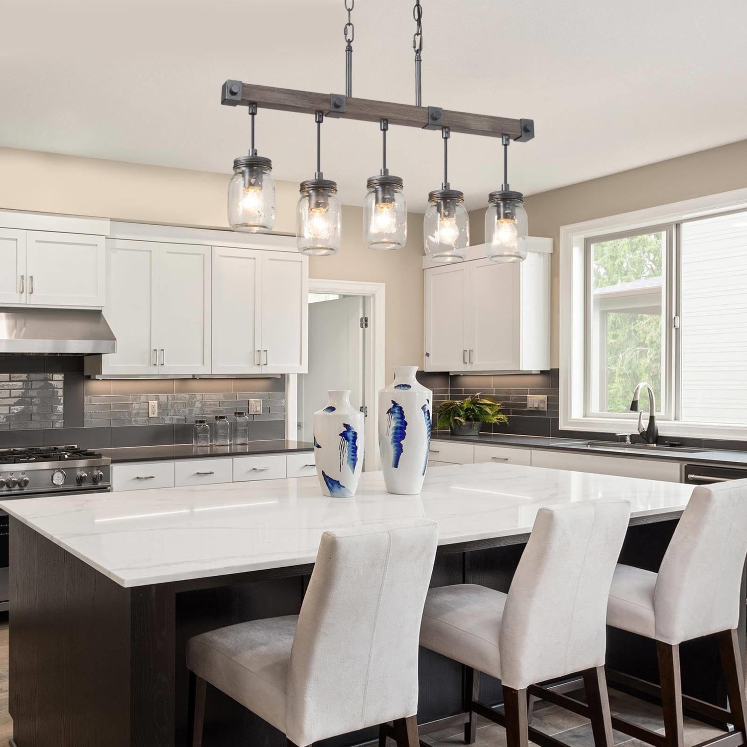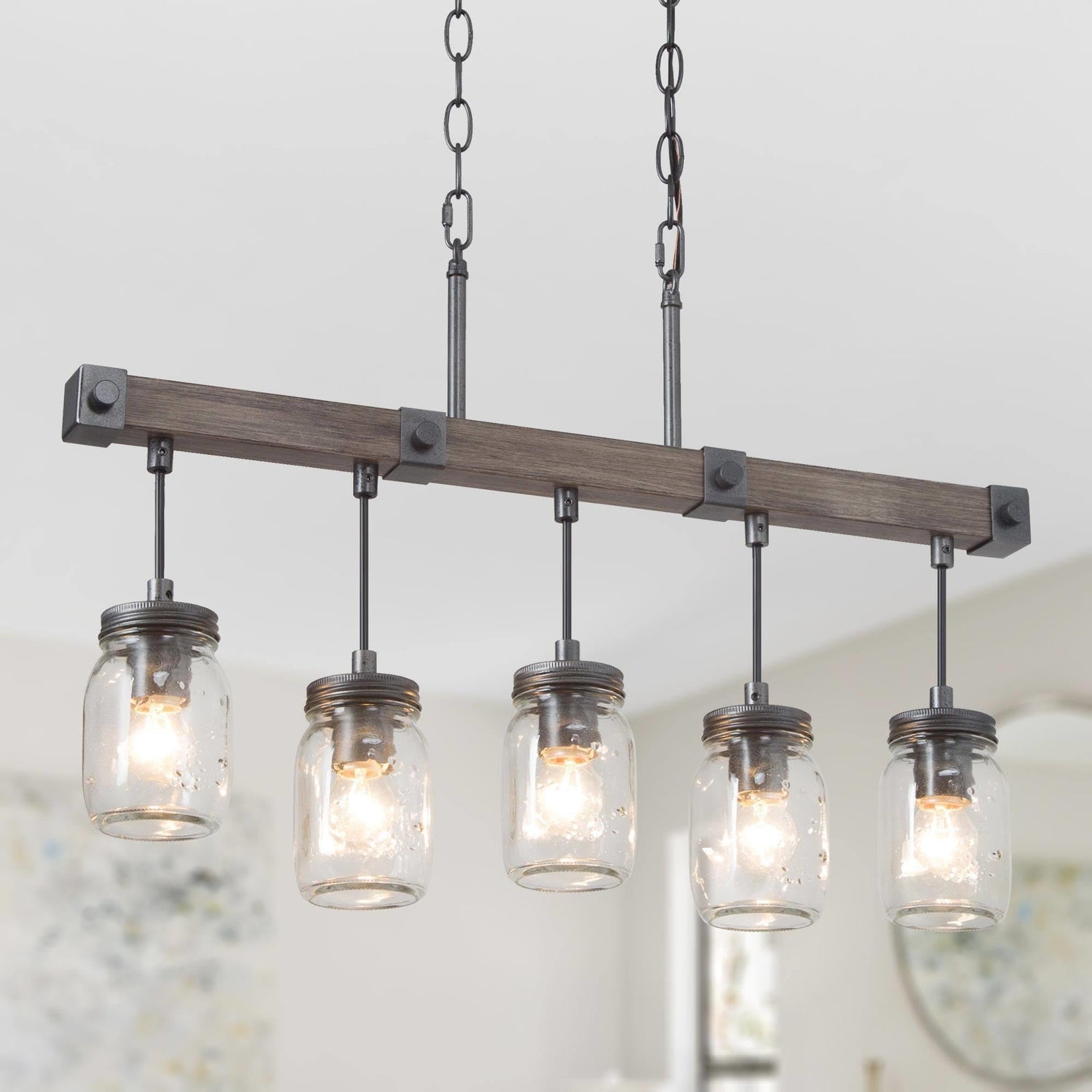 - [FARMHOUSE MASON JAR LIGHT] Experience the charm of rustic mason jar lights, thoughtfully crafted to brighten your kitchen, dining area, or any farmhouse-inspired setting. Constructed from Wooden Texture metal, this dining room lighting showcases five transparent mason jar shades suspended gracefully along a faux wood linear strip. The seamless blend of clear glass jars and sleek ironwork results in a contemporary rustic fusion.