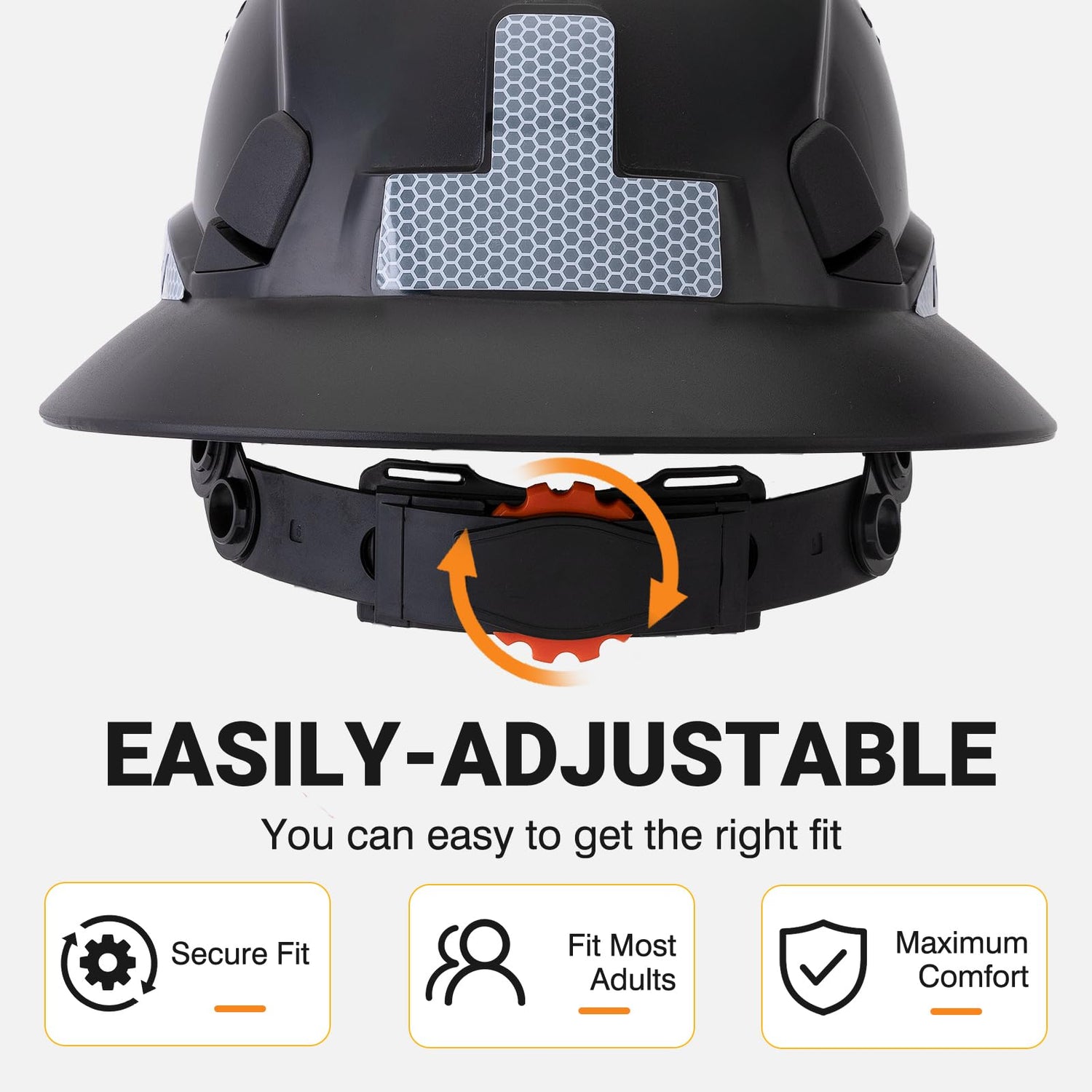 - COMFORTABLE FIT: This 6-point suspension construction hard hat fits hat sizes 20.86-24.80 inch. Simply turn the one-handed adjustment knob to tighten or loosen the fit without having to take the helmet off. An adjustable chin strap ensures it does not dislodge if the worker falls or is impacted by another object