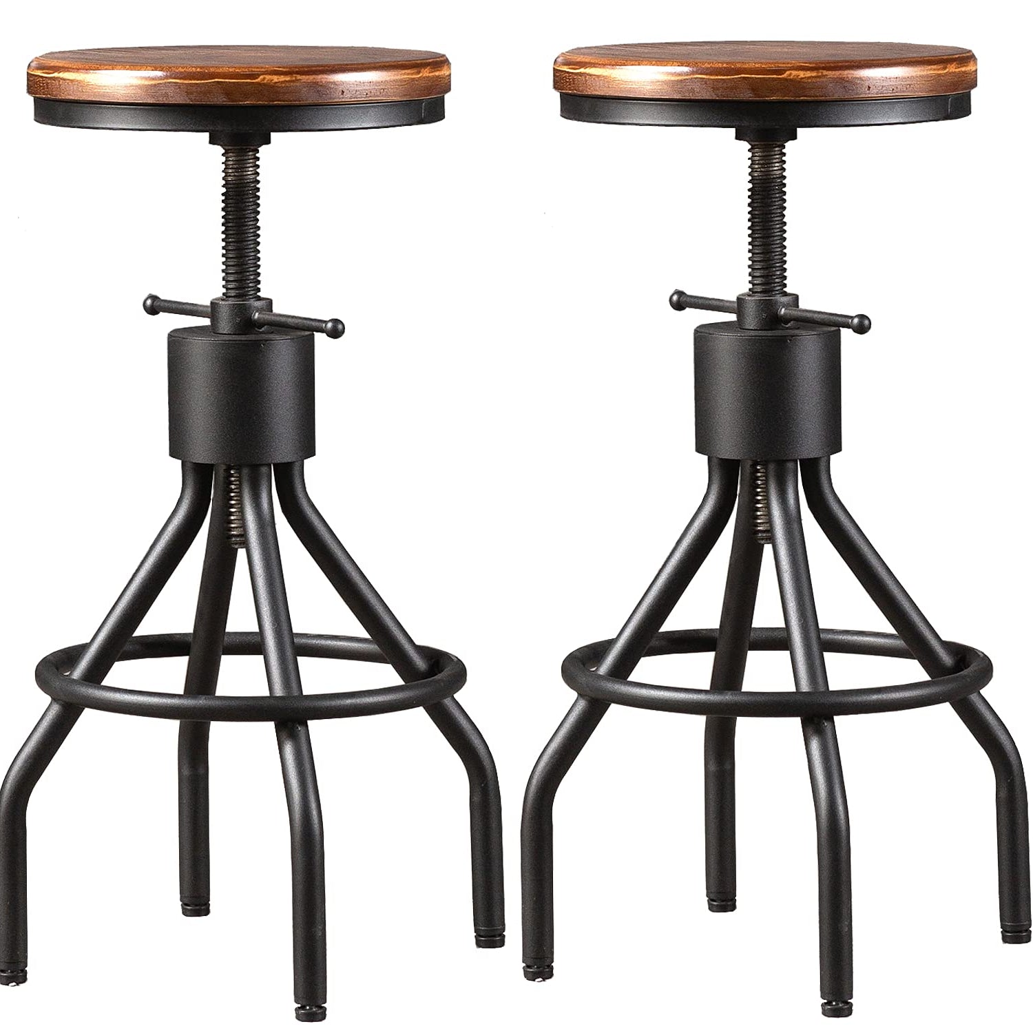 Details: Industrial Look Bar Stool-Vintage Adjustable Swivel Stool-Round Wood Top Metal Design Bar Stool-Cast Iron Stool-Kitchen Dining Chair-Counter Height Farmhouse Stool-Extra Tall Bar Height-Set of 2 Packing--Easily matches various decoration style home,farmhouse or bar; --Seat can swivel 360 degree,the footrest functions to reduce the pressure on your feet,provides a comfortable environment for guests. --Kitchen Counter Height, Bar height adjustable from 23.4 Inch to 33 Inch.