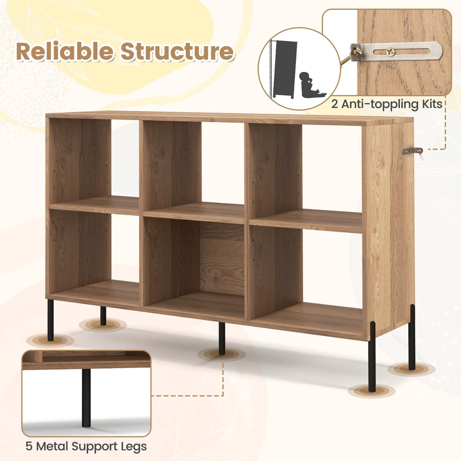LOKO 6 Cube Bookcase, 3-Tier Floor Open Bookshelf with 5 Metal Legs, Cube Storage Organizer with Adjustable Shelves, Modern Display Shelving for Living Room, Study, Bedroom, Office (Natural)