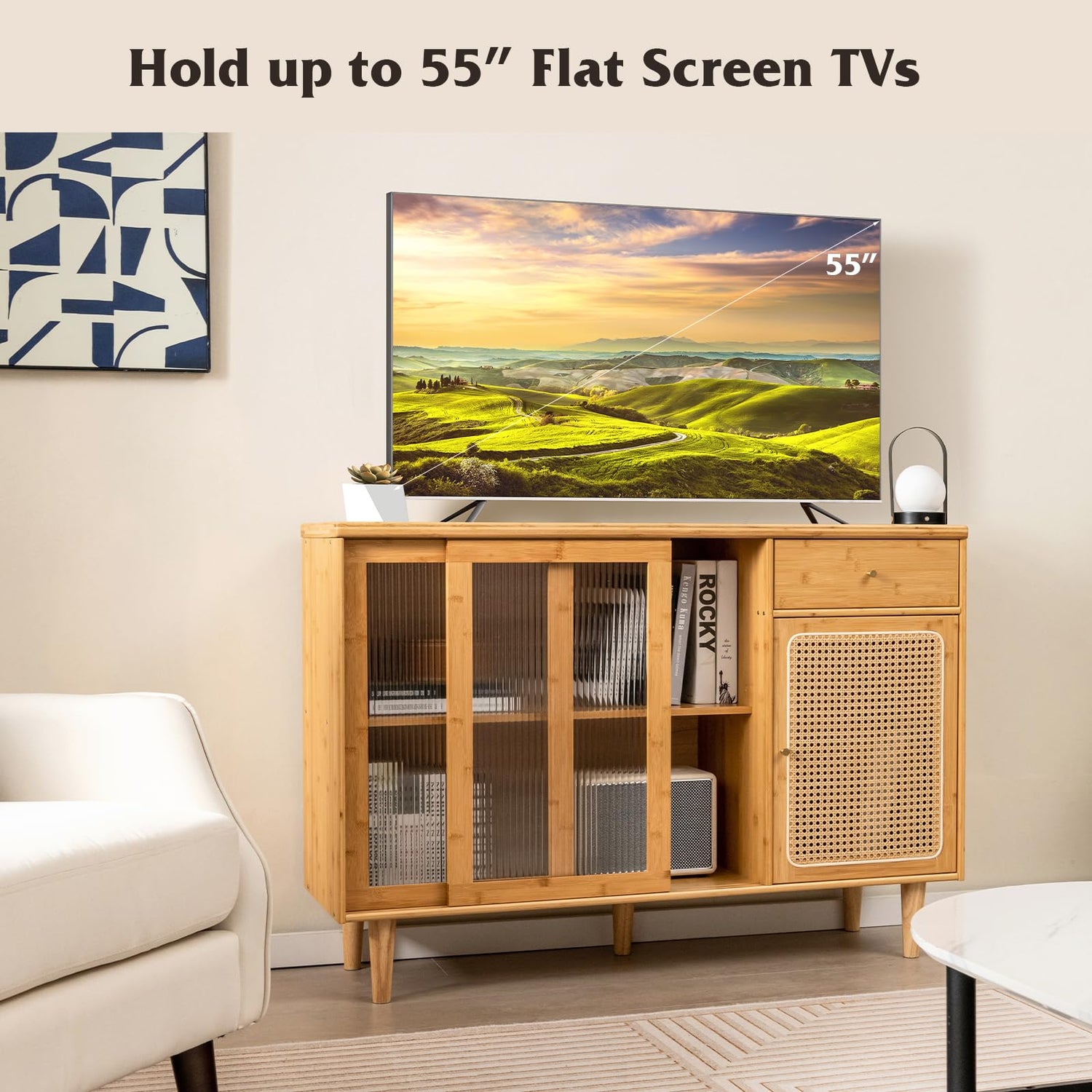 - Versatile Use: Whether you need extra storage in your kitchen, dining room, or entryway, this bamboo sideboard is perfect for any space, adding both functionality and elegance to your home decoration. It can even serve as a TV console cabinet that can hold up to 55" flat screen TVs.