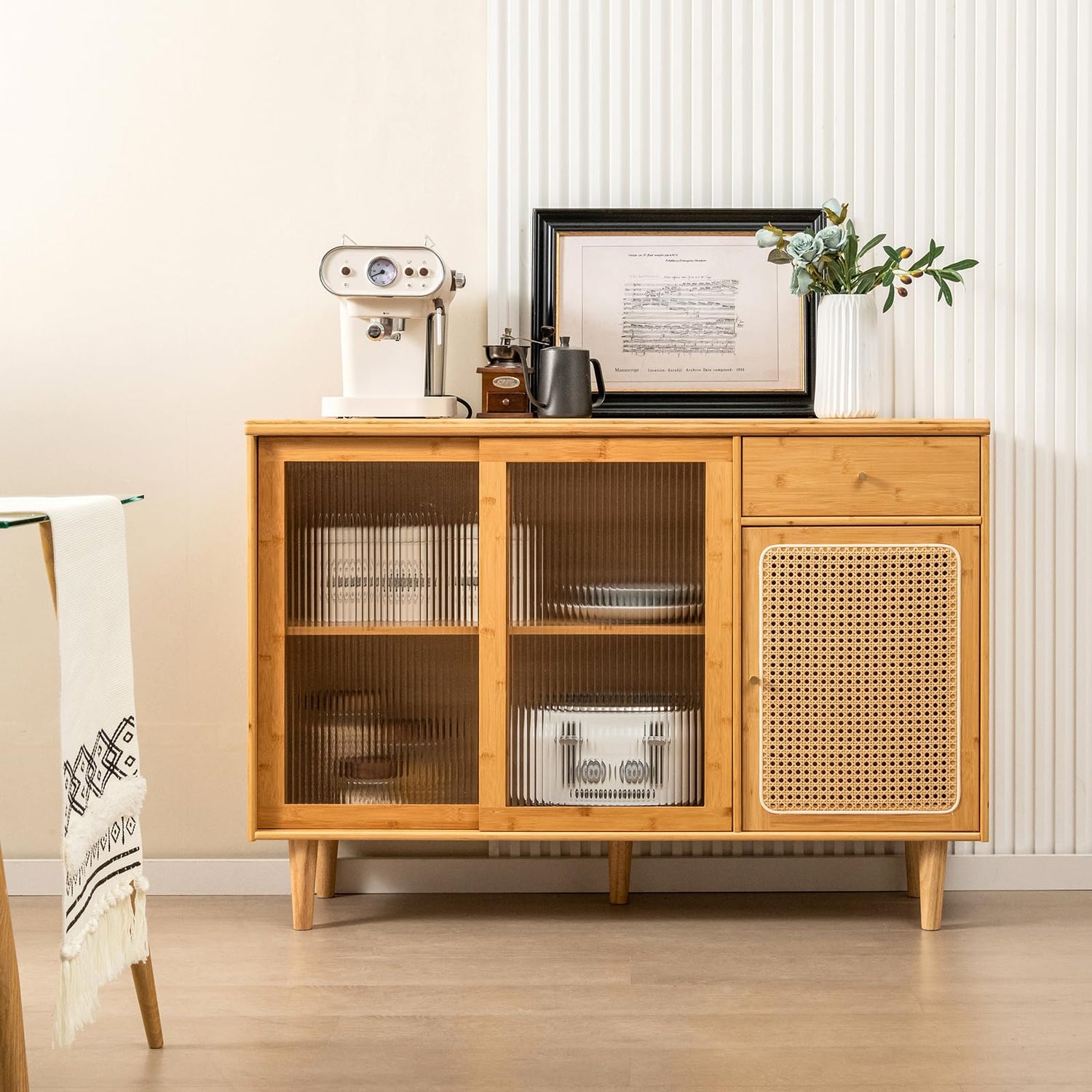 - Adequate Storage Capacity: To meet daily storage needs, the buffet sideboard comes with a sliding door cabinet, rattan door cabinet and a pull-out storage drawer. It offers ample space open or enclosed for tableware, kitchen appliances and other sundries.