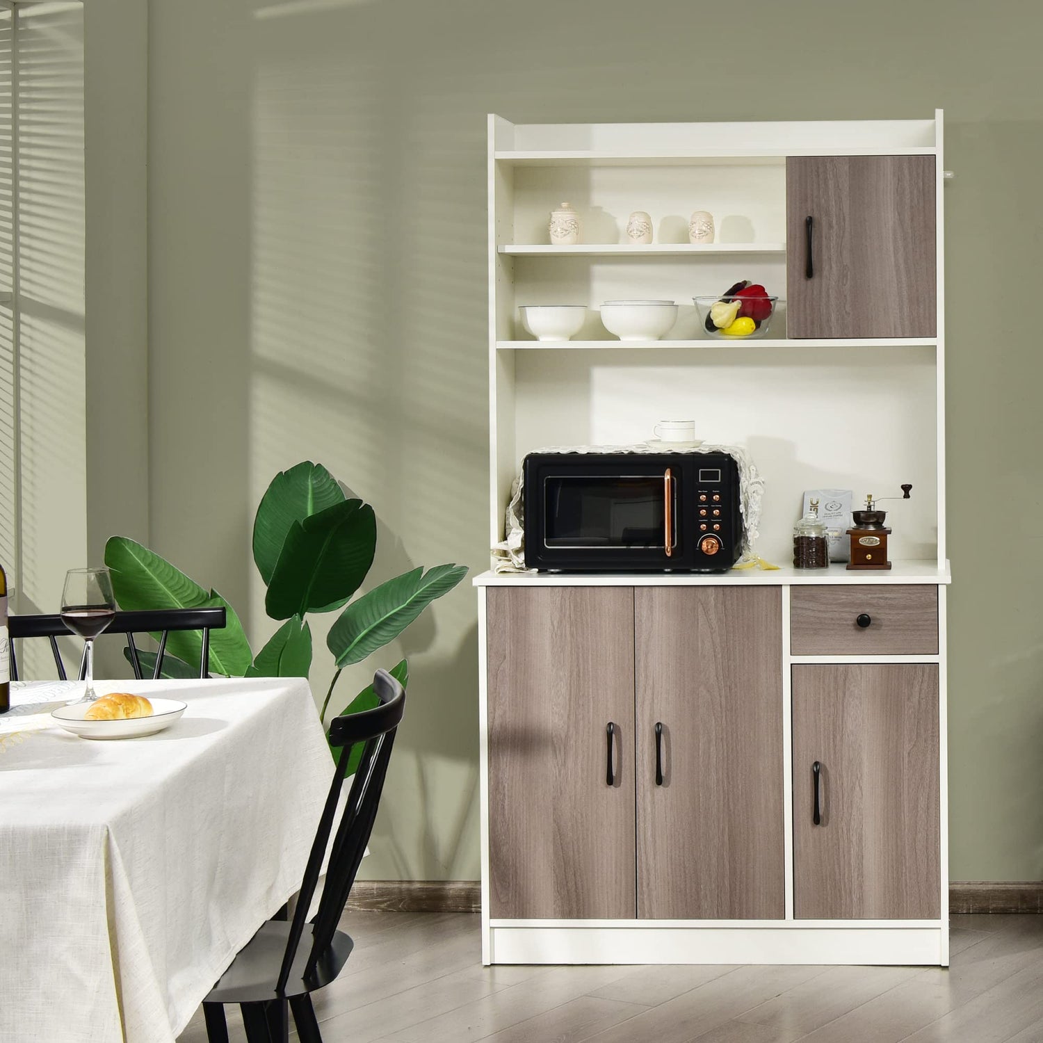 Details: Description LOKO kitchen hutch cabinet is not only providing you with ample storage space for storing kitchen stuffs, but also working as a reliable furniture in any place where it is located to become a member of your family to accompany you for the years to come. You could either display your exquisite collections on the open shelves or hide the clutter away in the storage cabinets or in the drawer. With adjustable shelves, you will never have to worry about the storage space fitting or not. Besides, the smooth and waterproof countertop with cable management hole on the back panel will be a nice spot for your functional small or medium kitchen appliances with wires being perfectly organized. What’s more, the anti-tip devices on the back will make the kitchen storage cabinet as stable as possible in daily use. Feature Multiple storage spaces, farewell to clutter Adjustable shelves, making storage more flexible Ant-tip devices keep the hutch cabinet stable Added back screws enhance the stability of the whole structure Wire management hole on the back panel for convenience Waterproof surface for easy maintenance Widely used in the kitchen, dining room or living room Specification Material: Particle board + MDF board Overall dimension:39.5” x 15.5” x 71” (L x W x H) Item weight: 123.5 lbs Weight capacity of the countertop: 110 lbs Weight capacity of each lower shelf: 44 lbs Weight capacity of each upper shelf: 22 lbs Weight capacity of the drawer: 11 lbs Package quantity: 2 packages Package includes: 1 x Kitchen cabinet