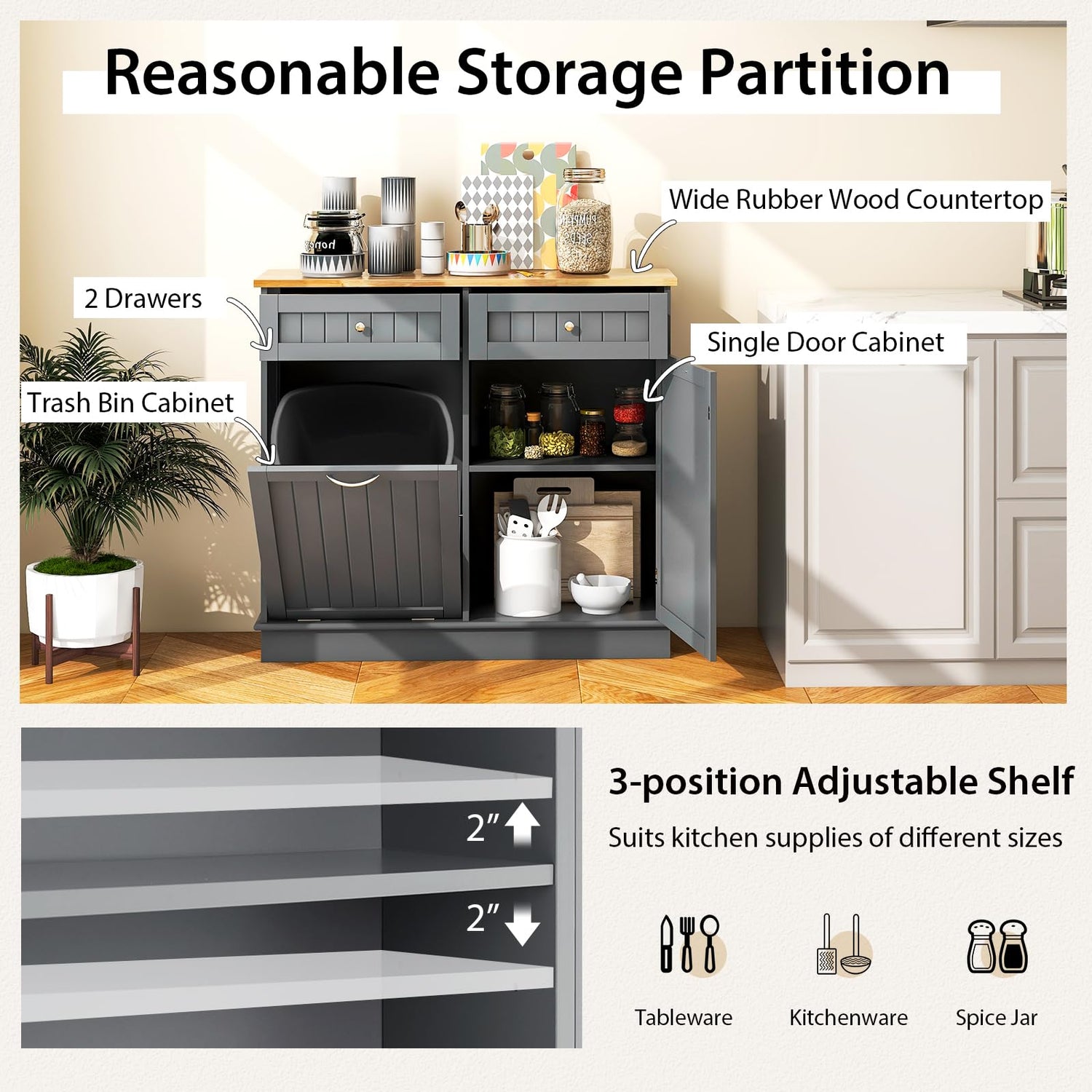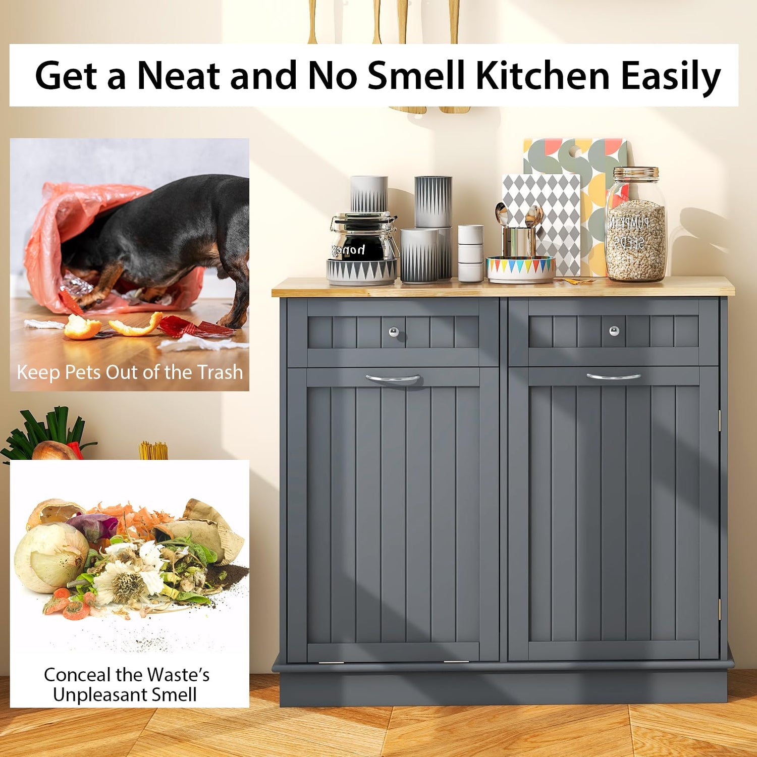 - [A Miscellaneous Existence]: Have no idea where to place this trash can cabinet? Just regard it as a common storage cabinet that providing extra storage space to daily necessities in order to keep the room stay clean and in order. The rubber wood countertop provides considerable storage space for small kitchen appliances, allowing you to use it as a coffee bar cabinet. Or you will even see it in the laundry since your laundry basket would lie cozily in the cabinet with tilt out door.