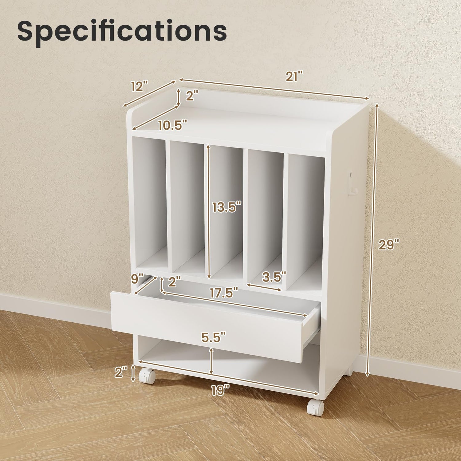 Boasting a generous top surface, a convenient pull-out drawer, and an open storage cube, this stand offers ample space for daily essentials and small accessories. The stand's 4 main compartments provide a tidy and accessible showcase for your beloved vinyl collections, ensuring easy browsing and retrieval. Equipped with 4 universal wheels, including 2 lockable ones, you can effortlessly move and secure the stand at your desired spot for optimal stability. Safety is paramount with the stand's sturdy construction featuring thickened boards and protective rounded corners, shielding your loved ones from potential hazards. Say goodbye to clutter with user-friendly features like metal slides for seamless item access and an additional hook for personalized customization. The stand's smooth and waterproof surface guarantees hassle-free cleaning, maintaining its pristine appearance effortlessly. Versatile and stylish, this stand is a perfect addition for any indoor setting, merging practicality with chic design effortlessly.