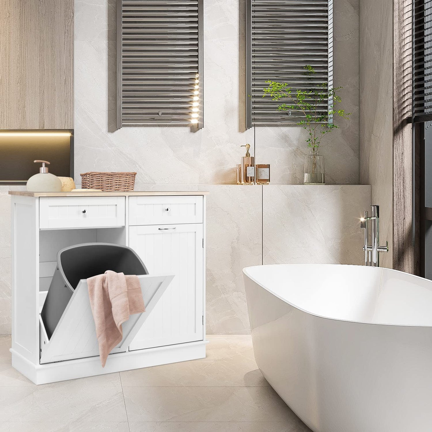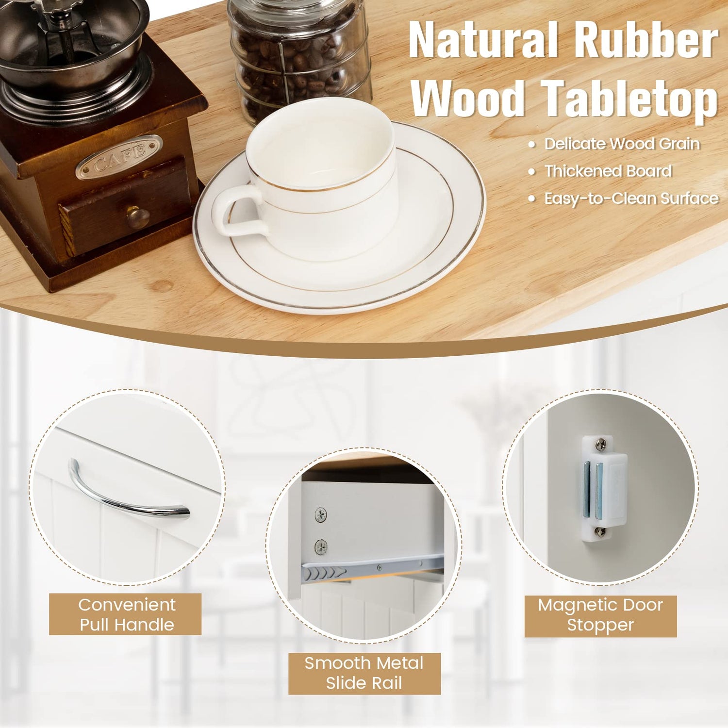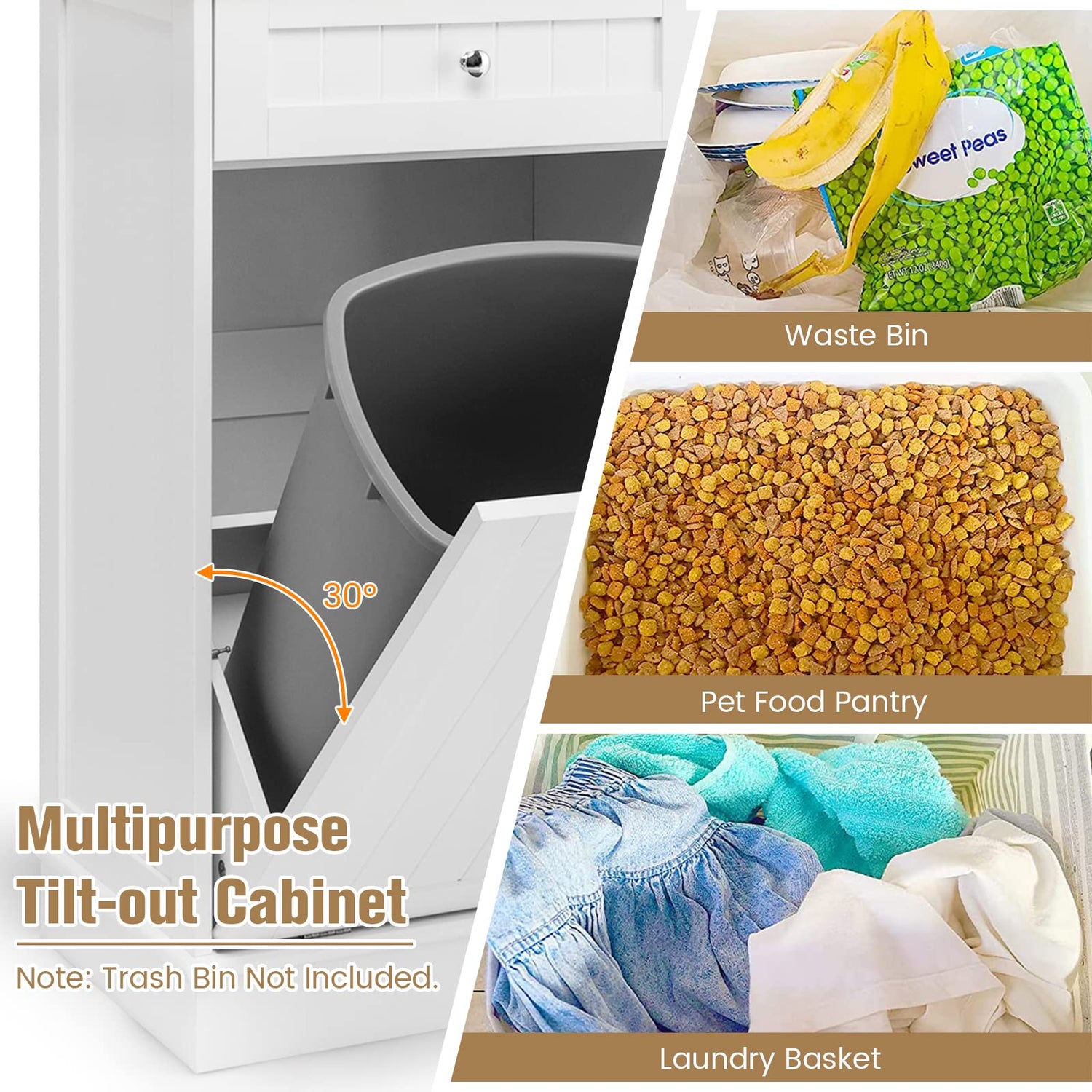 - [A Miscellaneous Existence]: Have no idea where to place this trash can cabinet? Just regard it as a common storage cabinet that providing extra storage space to daily necessities in order to keep the room stay clean and in order. The rubber wood countertop provides considerable storage space for small kitchen appliances, allowing you to use it as a coffee bar cabinet. Or you will even see it in the laundry since your laundry basket would lie cozily in the cabinet with tilt out door.