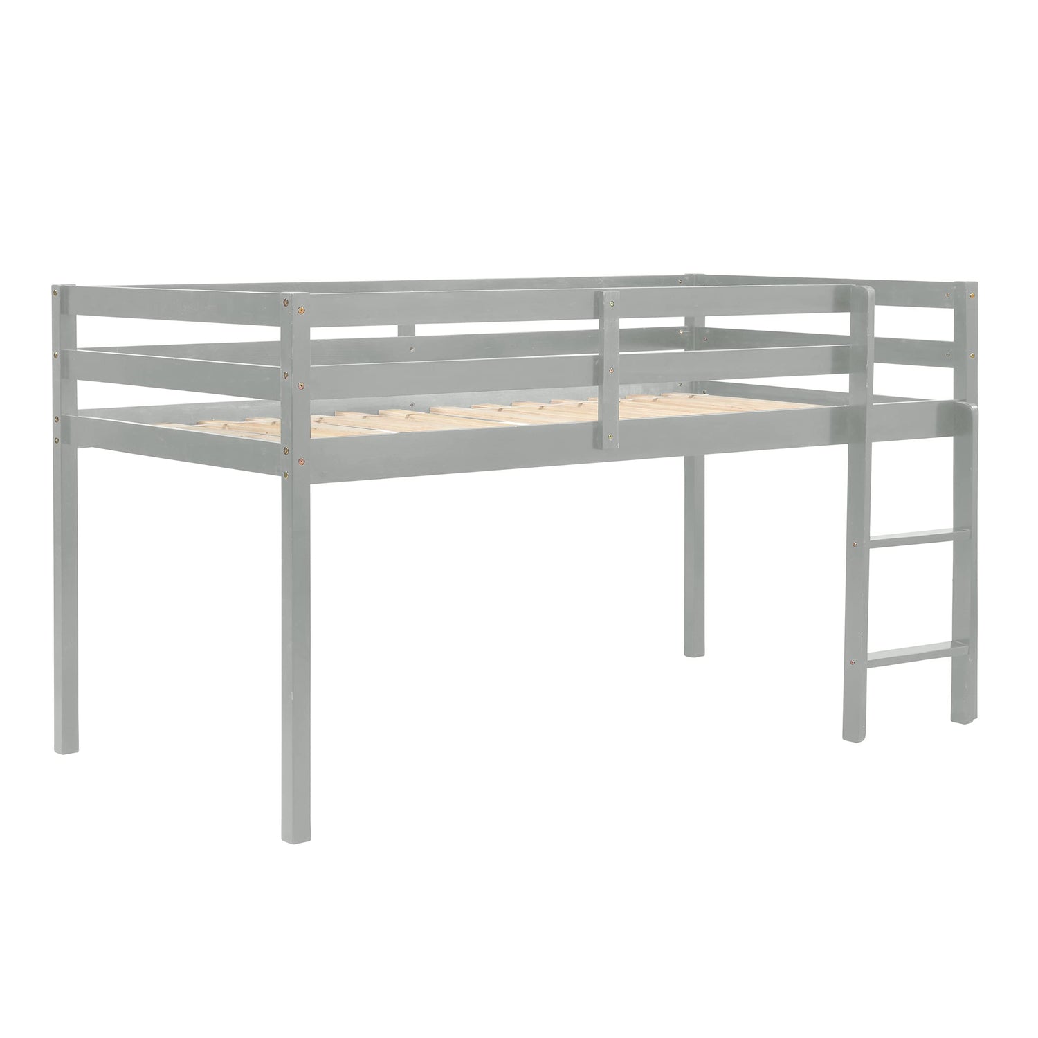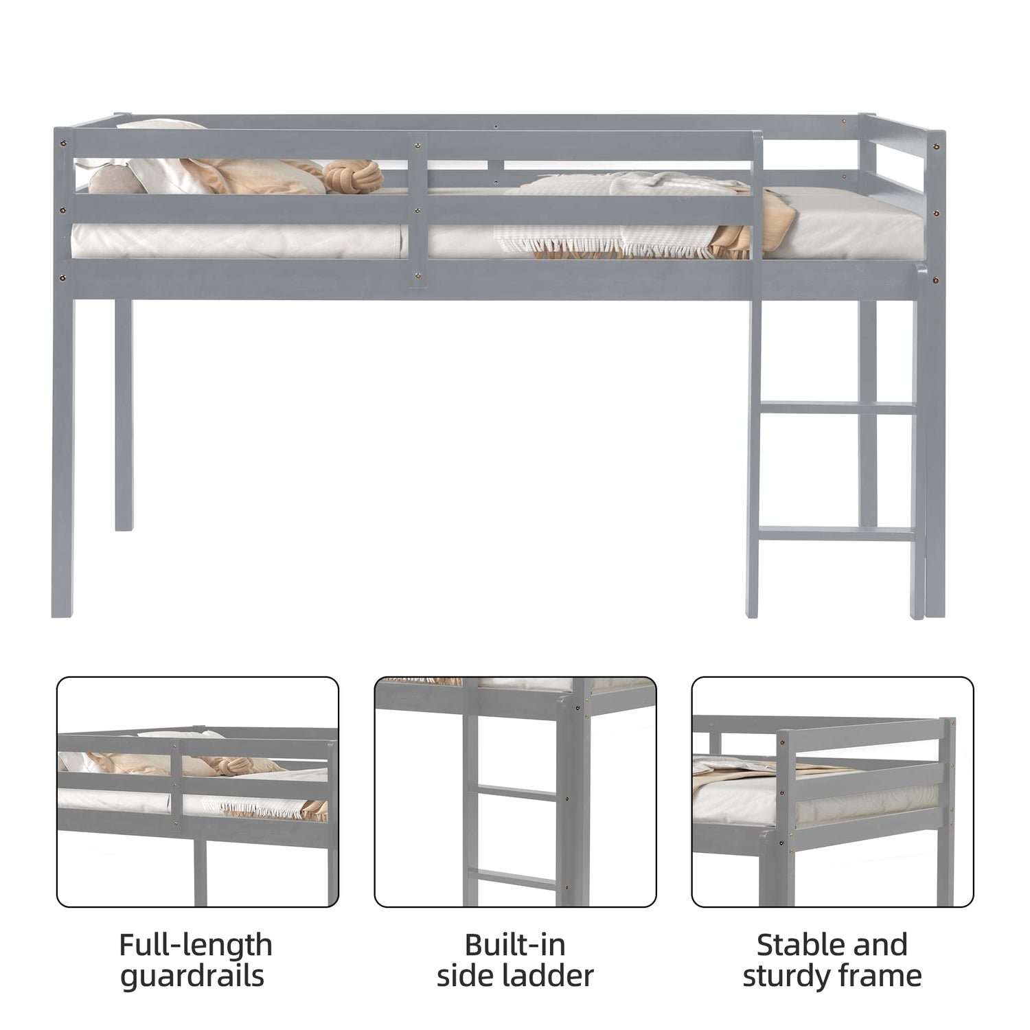LoLado Twin Loft Bed - Grey Solid Wood Bed Frame with Guard Rails and Built-In Ladder for Kids