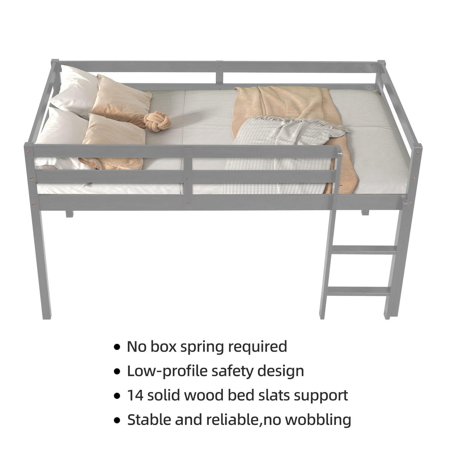 Introducing the LoLado Twin Loft Bed – a perfect blend of style, safety, and functionality designed specifically for kids. This grey solid wood bed frame not only elevates sleep but also creates a space-saving solution suited for any bedroom layout.