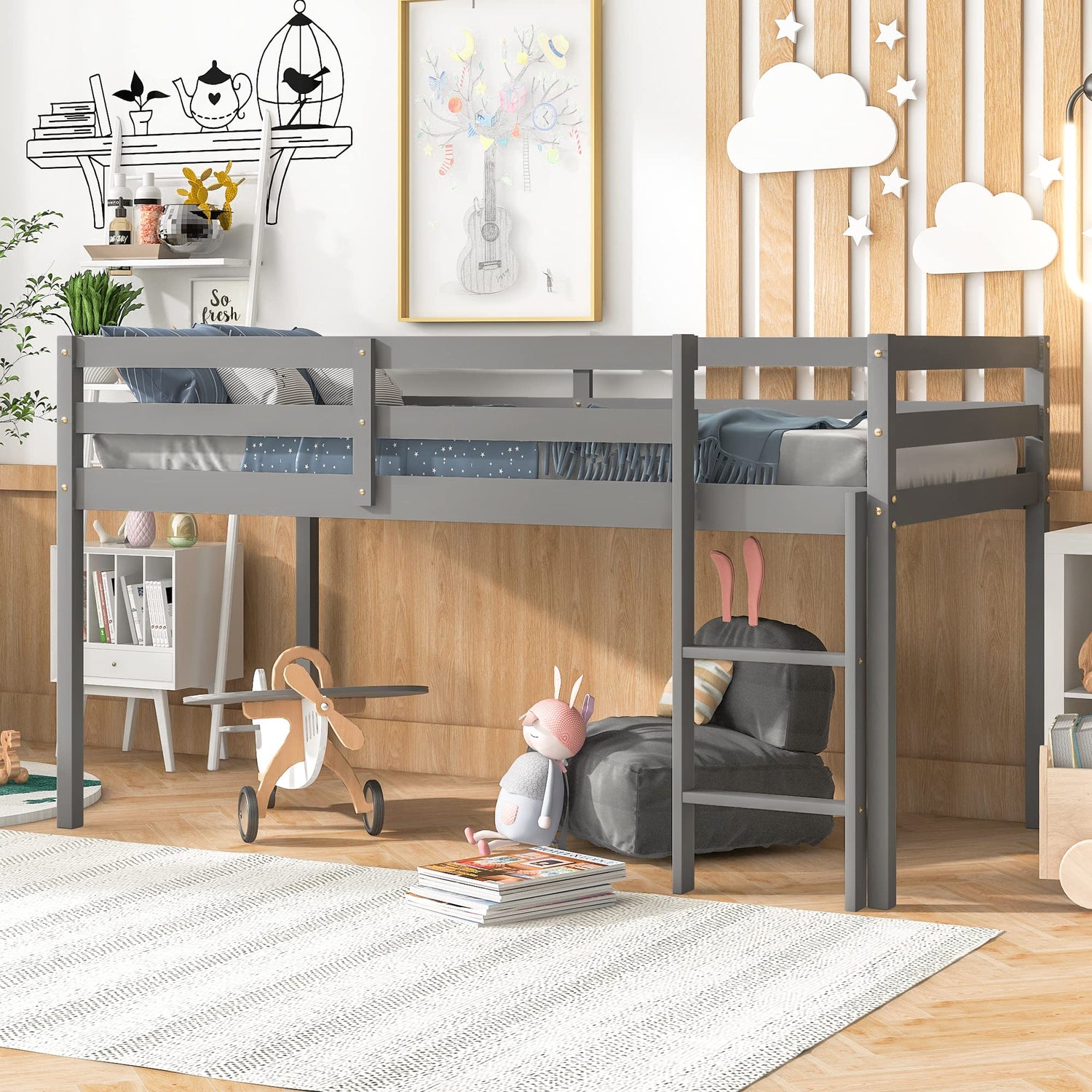 Embrace a unique design that opens up ground space for toys, books, or additional storage. The low loft configuration features full-length guardrails and a built-in ladder, ensuring the utmost safety for your little ones as they climb in and out of bed.