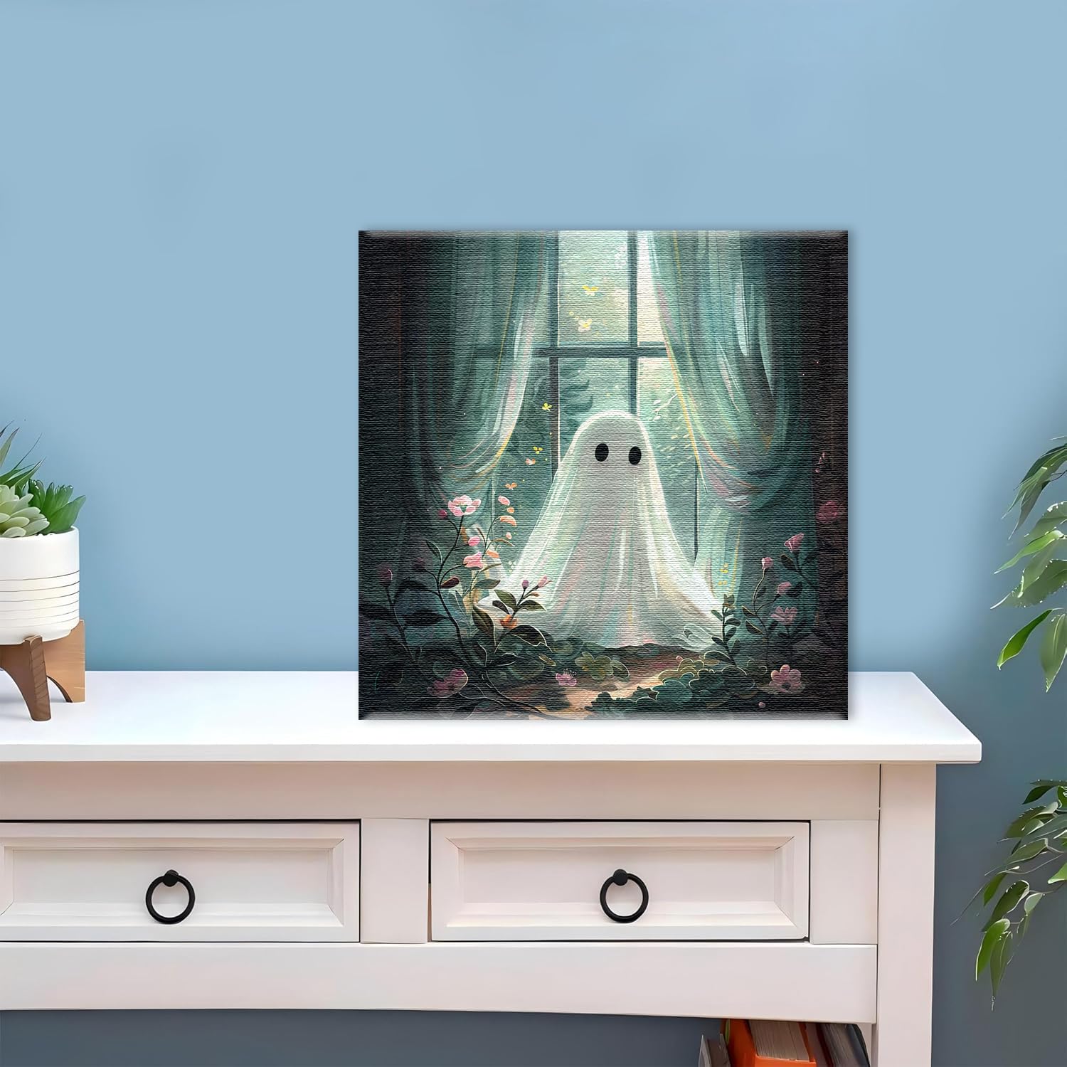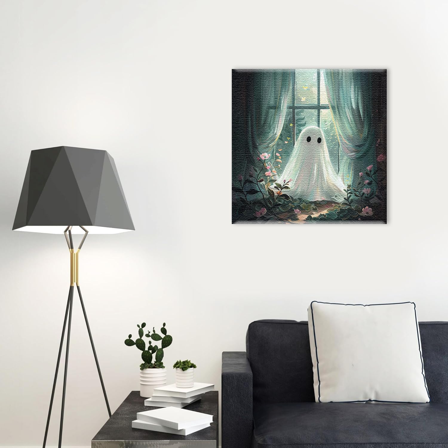 - In a cozy room, a gentle ghost floats by the window, bathed in soft morning light. The curtains flutter lightly, and flowers bloom around, creating a serene atmosphere. This scene embodies peace and harmony, brings calmness to any space.