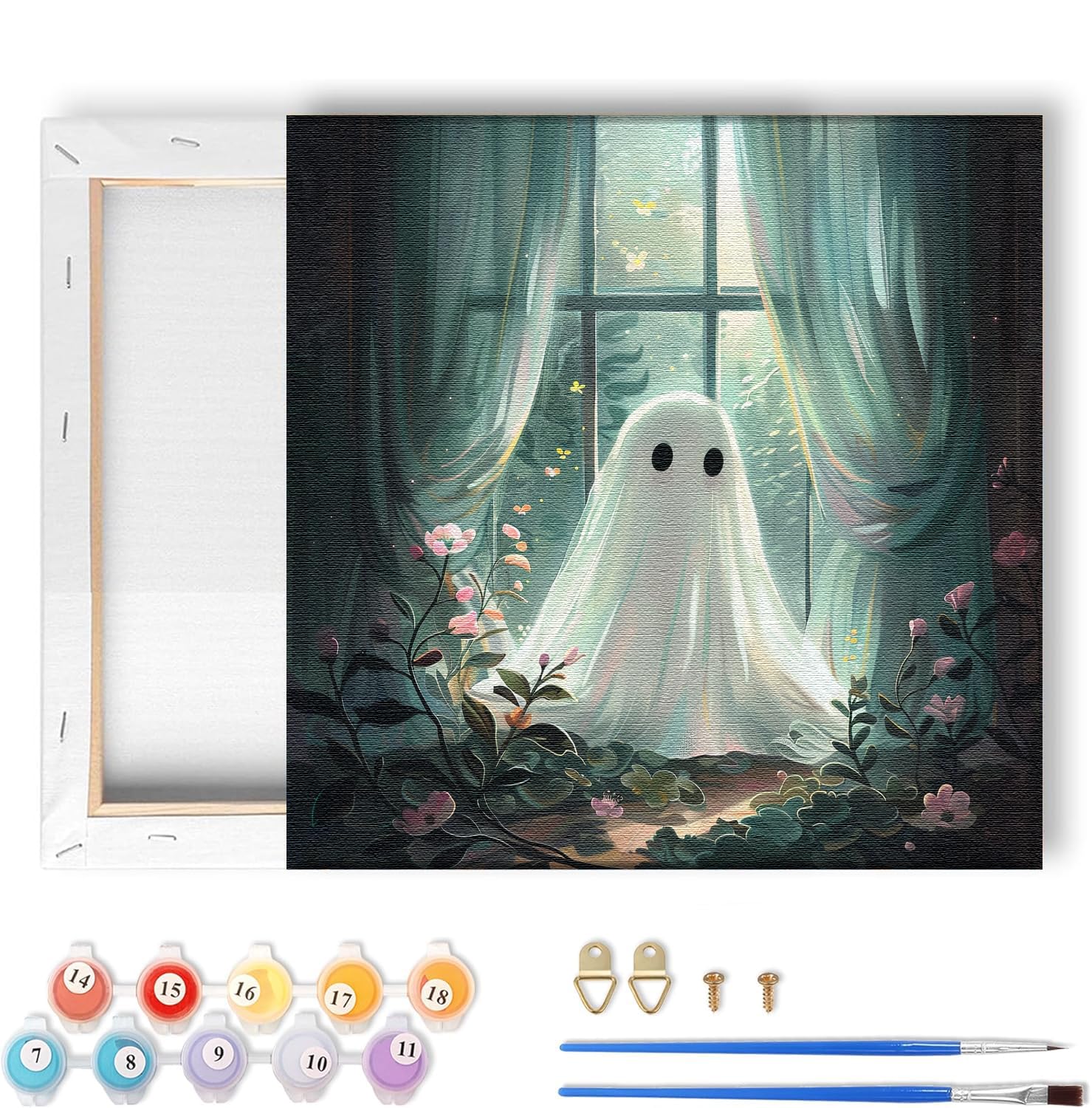 LOMSIOY Frame Paint by Number Kit for Adults, DIY Easy Halloween Ghost Oil Painting with Brushes, Hooks - Lone Watcher Framed Art Kits for Beginners - Suitable for Bedroom, Wall, Door Decor (8x8 Inch)
