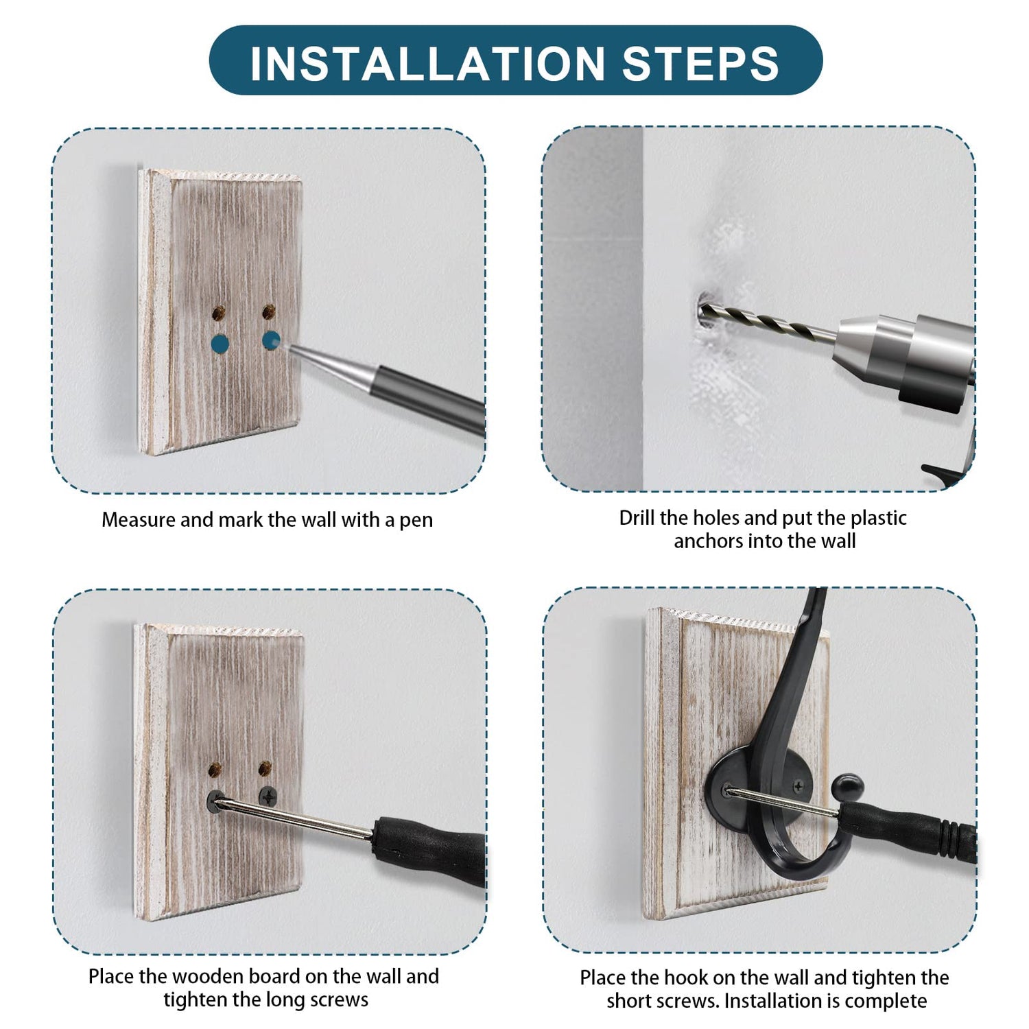- 【Easy to Install】Wall-mounted bathroom towel robe hook, super easy to install. Just drill holes, insert wall anchors and screw the wood board and hook to the wall. Suitable for painted wall, drywall, stucco wall, tile wall and most wood metal surfaces.