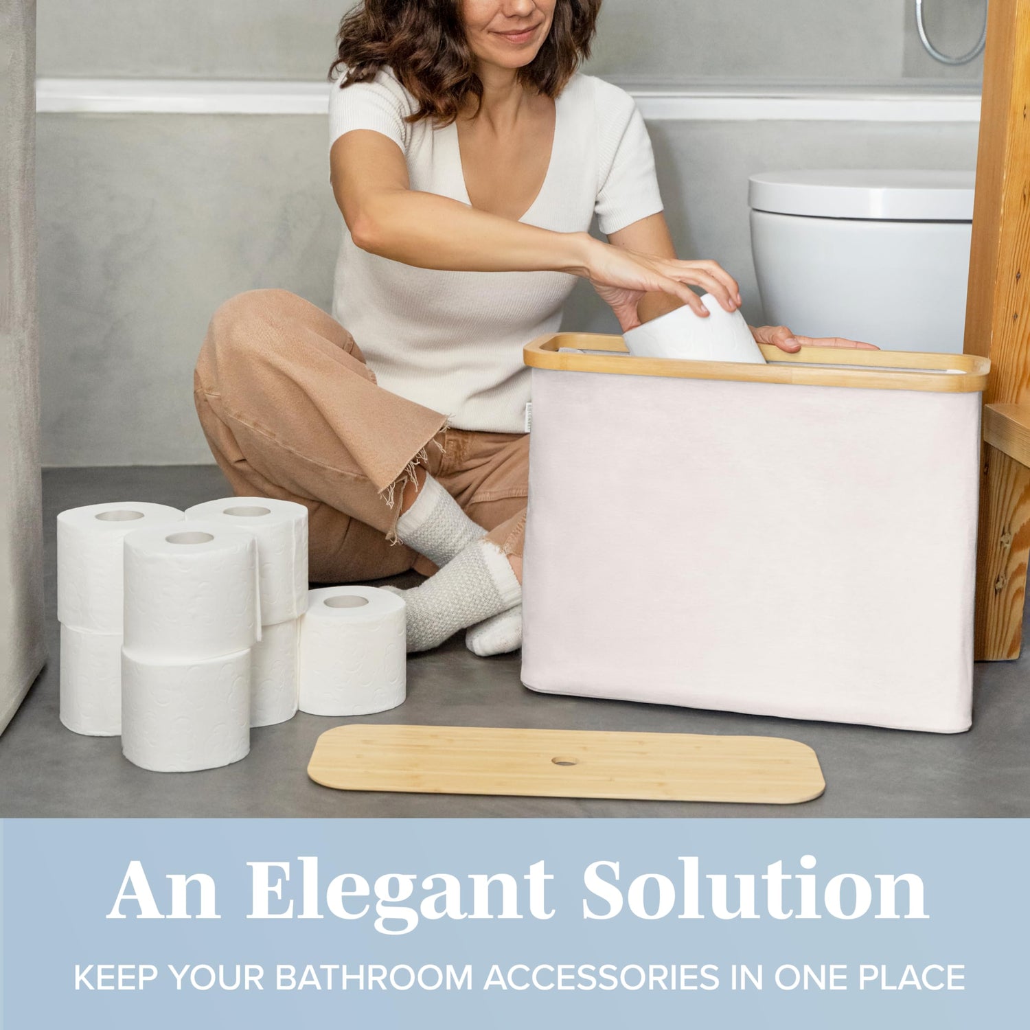 - 【Bamboo Materials】Our Toilet Paper Basket is made with high-quality breathable materials that keep homes smelling good. The wooden parts of the bathroom organizer is made with bamboo. This storage basket offers an elegant look for your bathroom or utility closet. Available in 4 different colors!