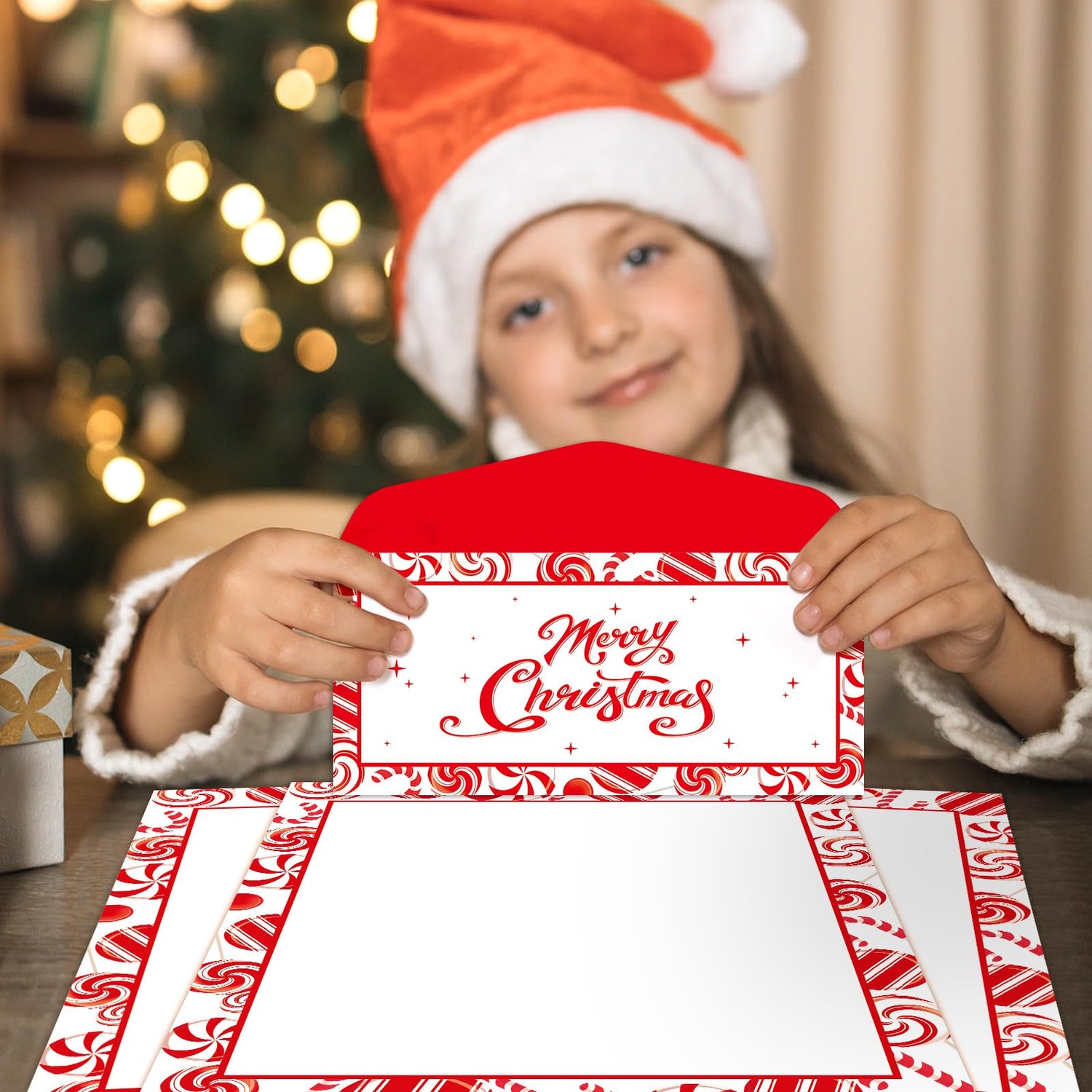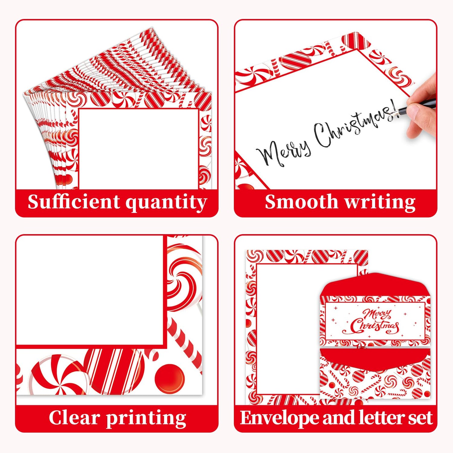 Lonfliness 50 Set Peppermint Christmas Letterhead with Paper Envelopes Candy Cane Christmas Border Computer Print Paper Stationery for Note Letters to Santa Invitations Office School 8.5 x 11 In