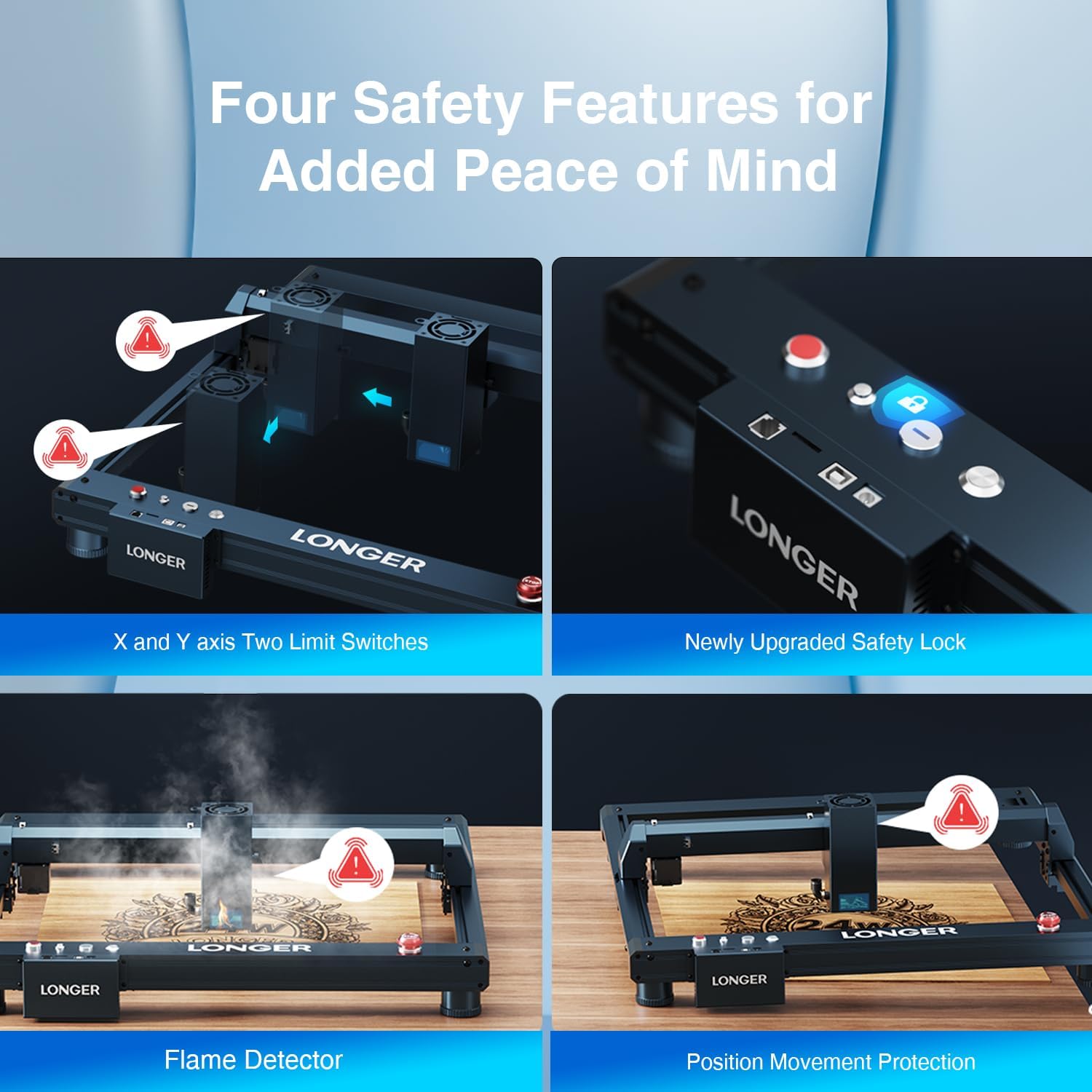 - Advanced Safety Features :Your safety is our top priority. The Laser B1 is equipped with eight major safety features, including Move/Flame/Offline/Motionless/Security Lock/Eye Protection/Emergency Stop/Zero Reset. Work with peace of mind, knowing that your well-being is safeguarded.