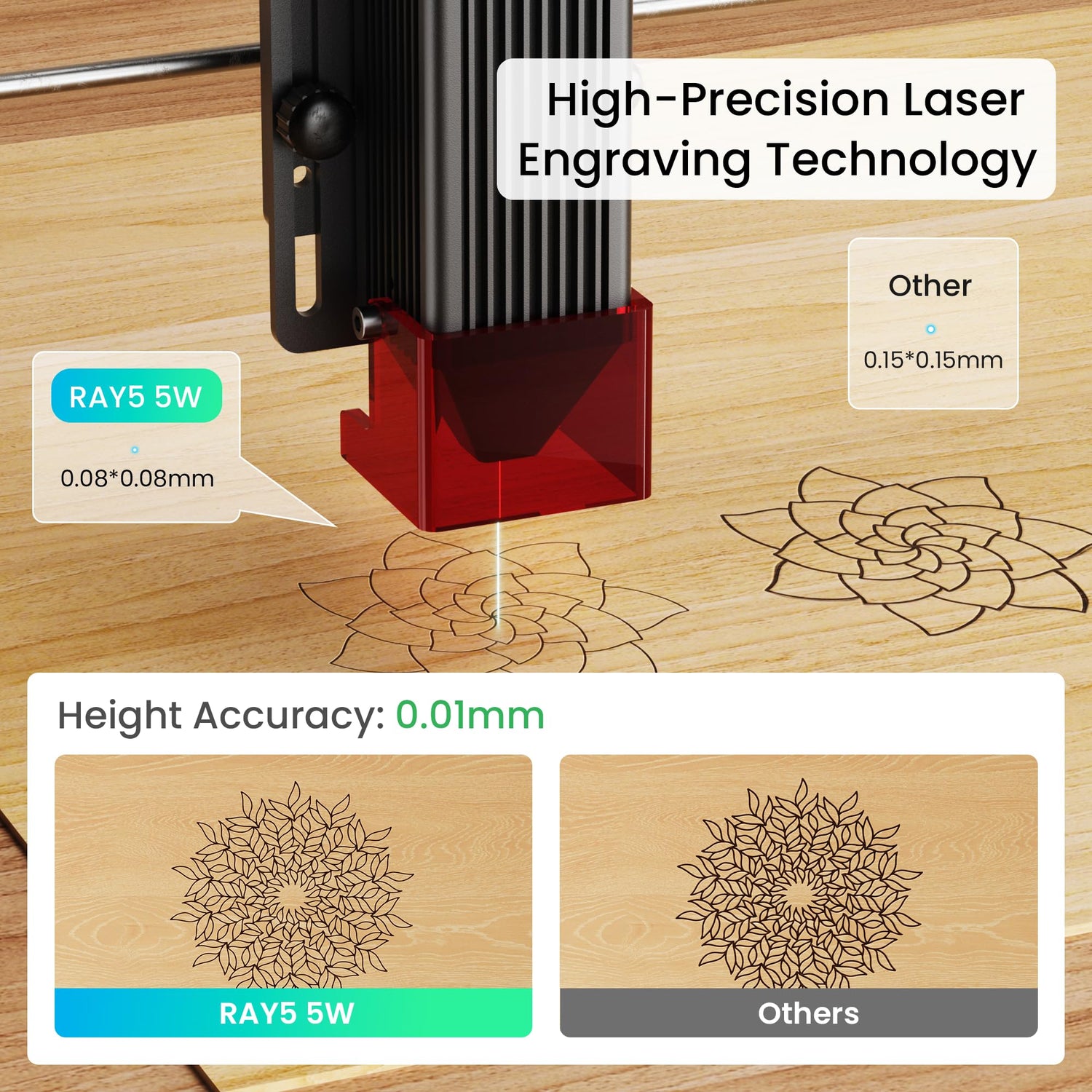 - 【High-Precision Laser Engraving】The Longer Ray5 laser engraver 5W utilizes advanced laser technology, featuring a laser point size of 0.08*0.08mm and an engraving accuracy of 0.01mm. This ensures precise engraving down to 0.01mm, enabling intricate designs and detailed patterns.
