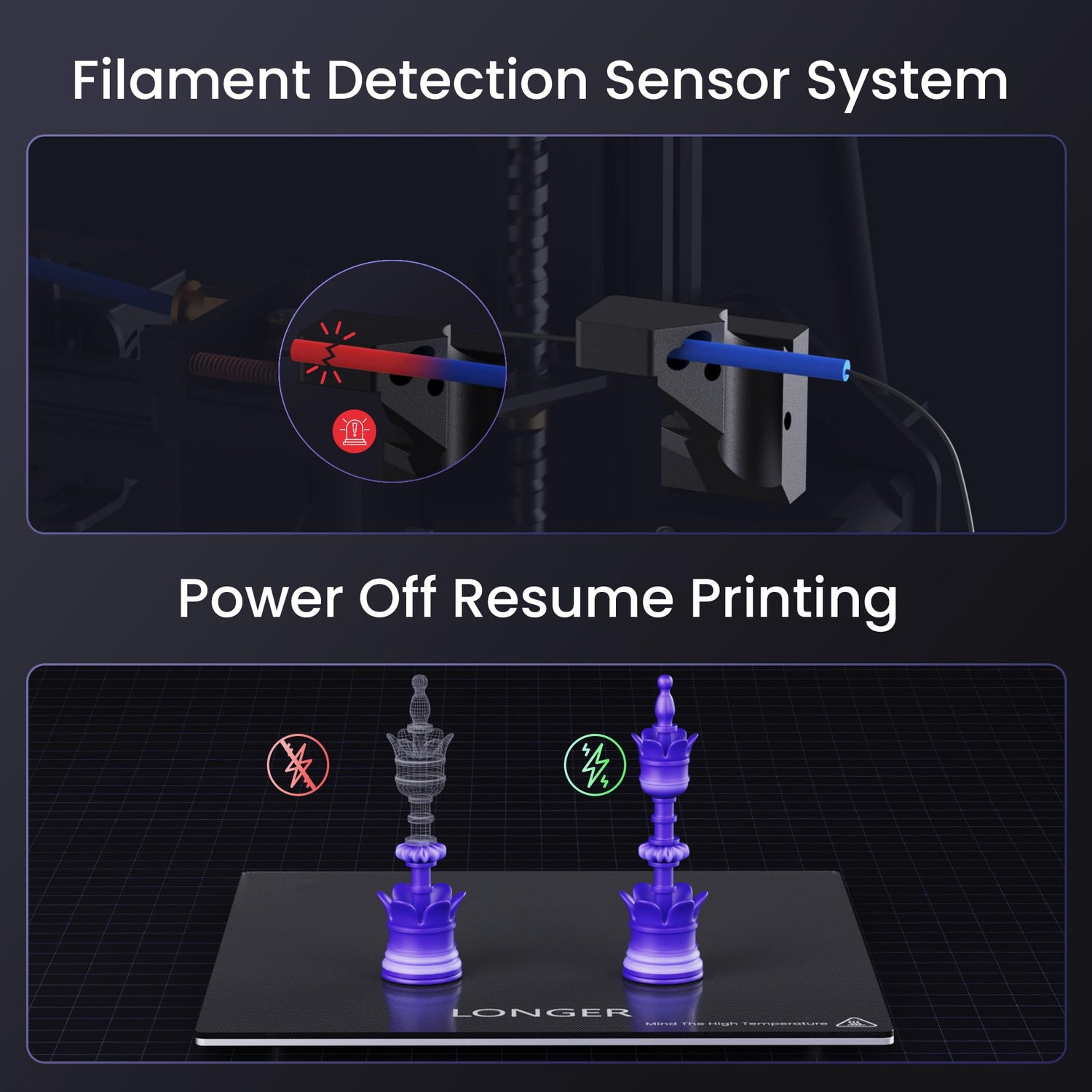 - 【Filament Exhaustion Detection & Resume Printing Function】 Longer 3D printer is equipped with filament and power detection sensors, which will intelligently pause the printing process if encountering filament exhaustion or unexpected power failure. It can resume printing from the last printing position when power is restored, saving your time and reducing waste.