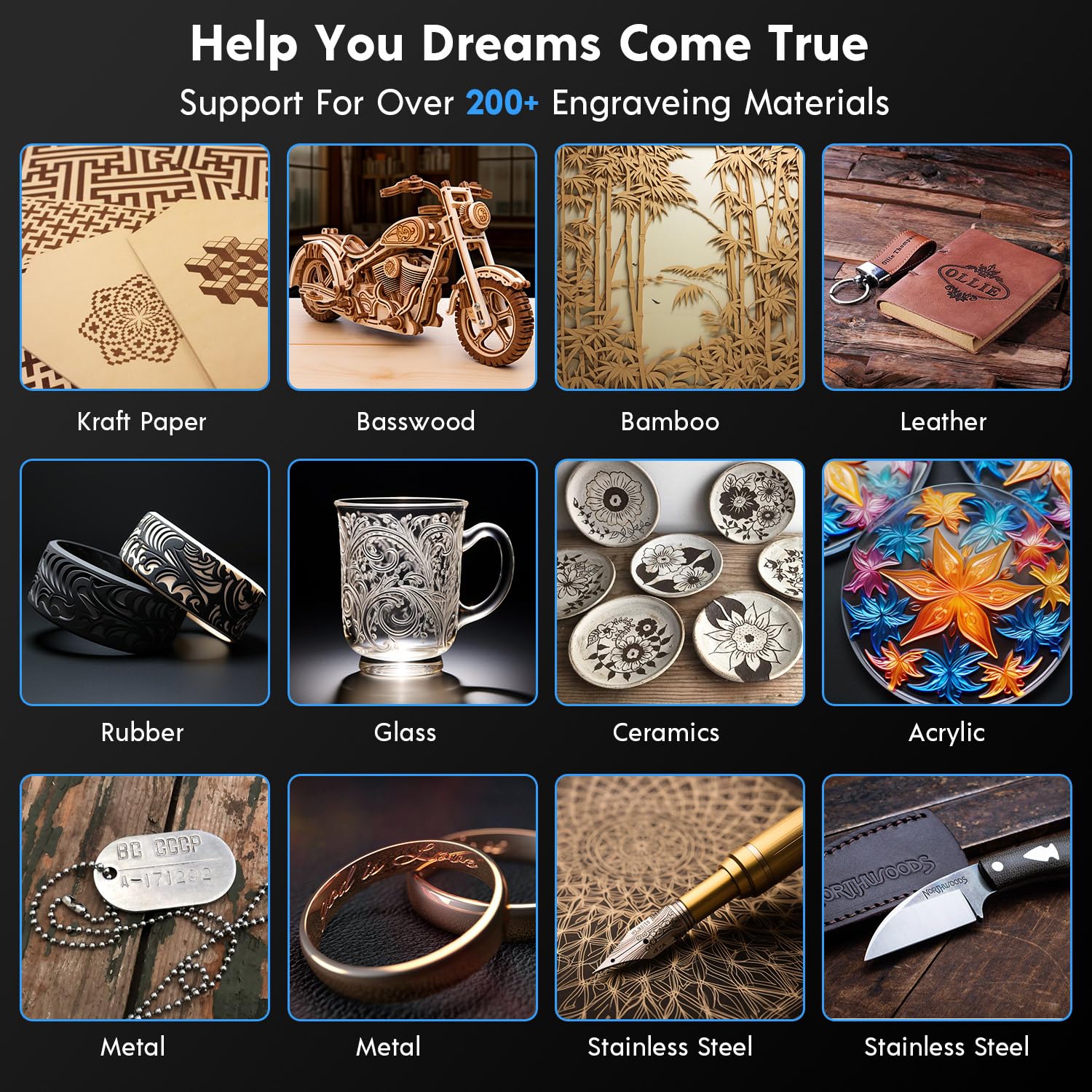 - Versatility for Various Materials: The laser engraving machine is suitable for a wide range of materials such as cutting 25mm wood and 35mm acrylic, cutting 0. 002"/0.05mm stainless steel as well as leather, paper, glass, plastics and more. Customers can use a single machine for engraving and cutting different materials, enhancing production and creative versatility. (An air pump is recommended for better engraving and cutting effects.)
