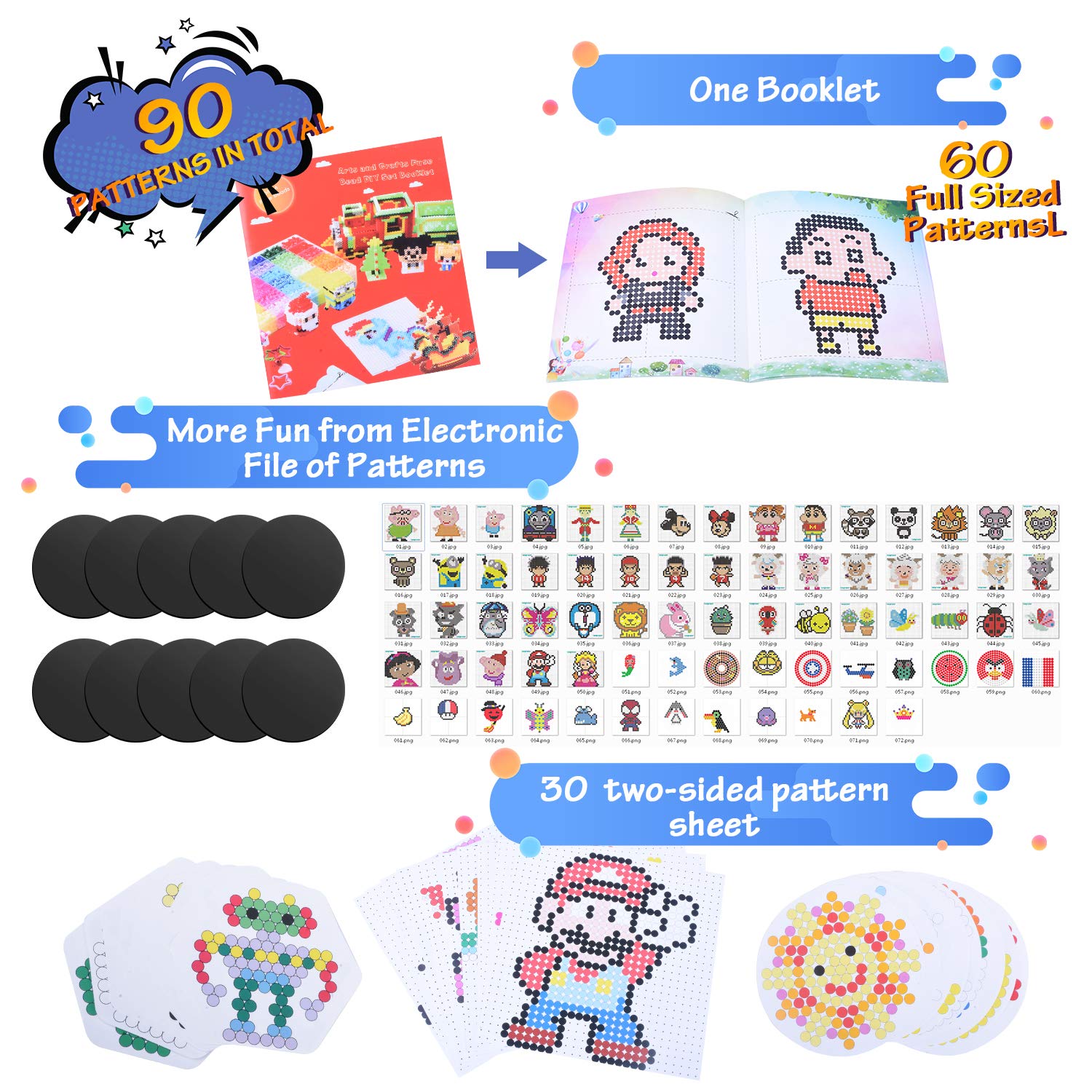 - [All fuse beads kits in One Set] 10000 PCS fuse beads with 36 colors, including Pattern booklet (60 different 1:1 full sized patterns+30 patterns paper), ruseable iron paper, shape pegboards and tweezers. Colorful fuse beads kits comes with all accessories to develop kids’imagination and handcraft ability. Make learning more interesting.