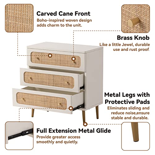 LONYKE Wicker Rattan Chest of Drawers, 3-Drawer Dresser, White Finish Wooden Storage Cabinet, Modern Farmhouse Accent Table, Boho Mid-Century Coastal Sideboard