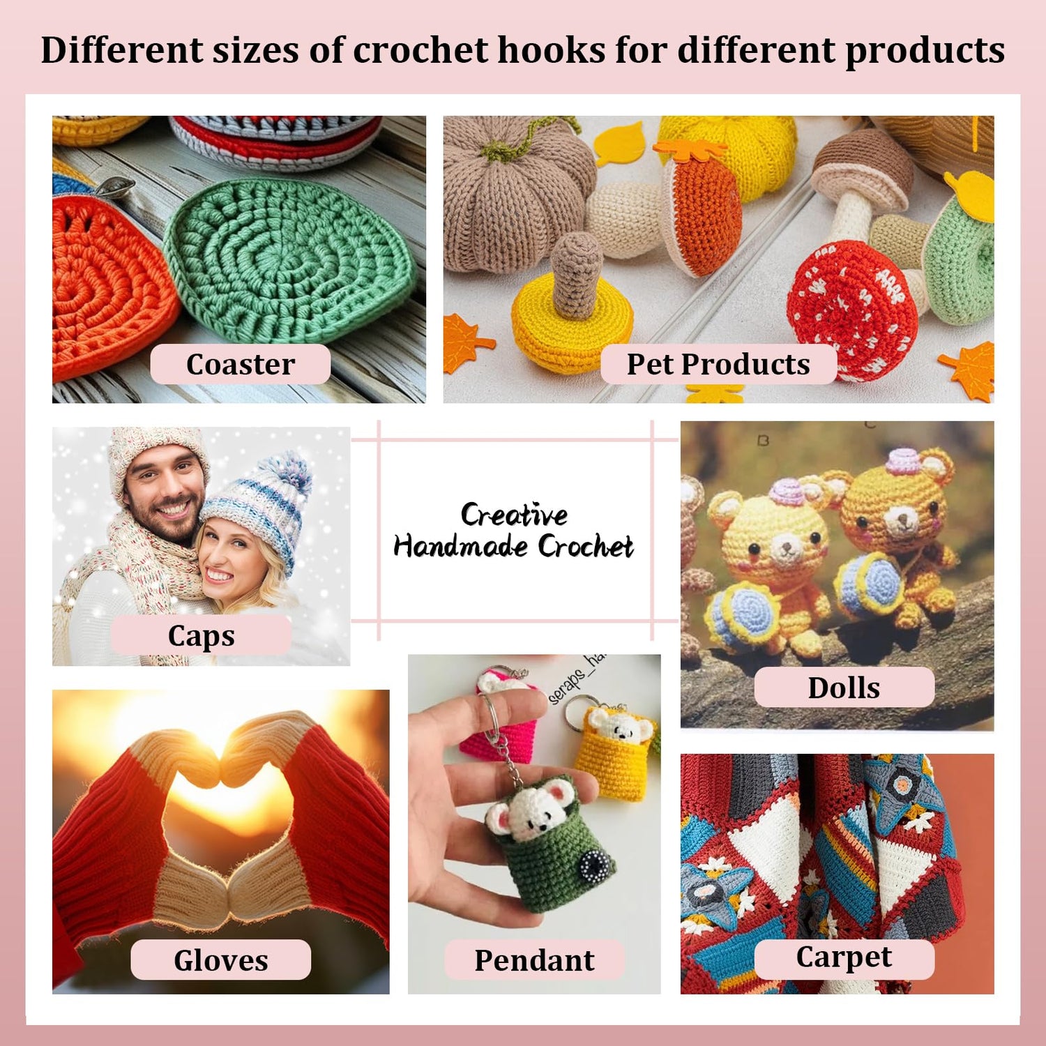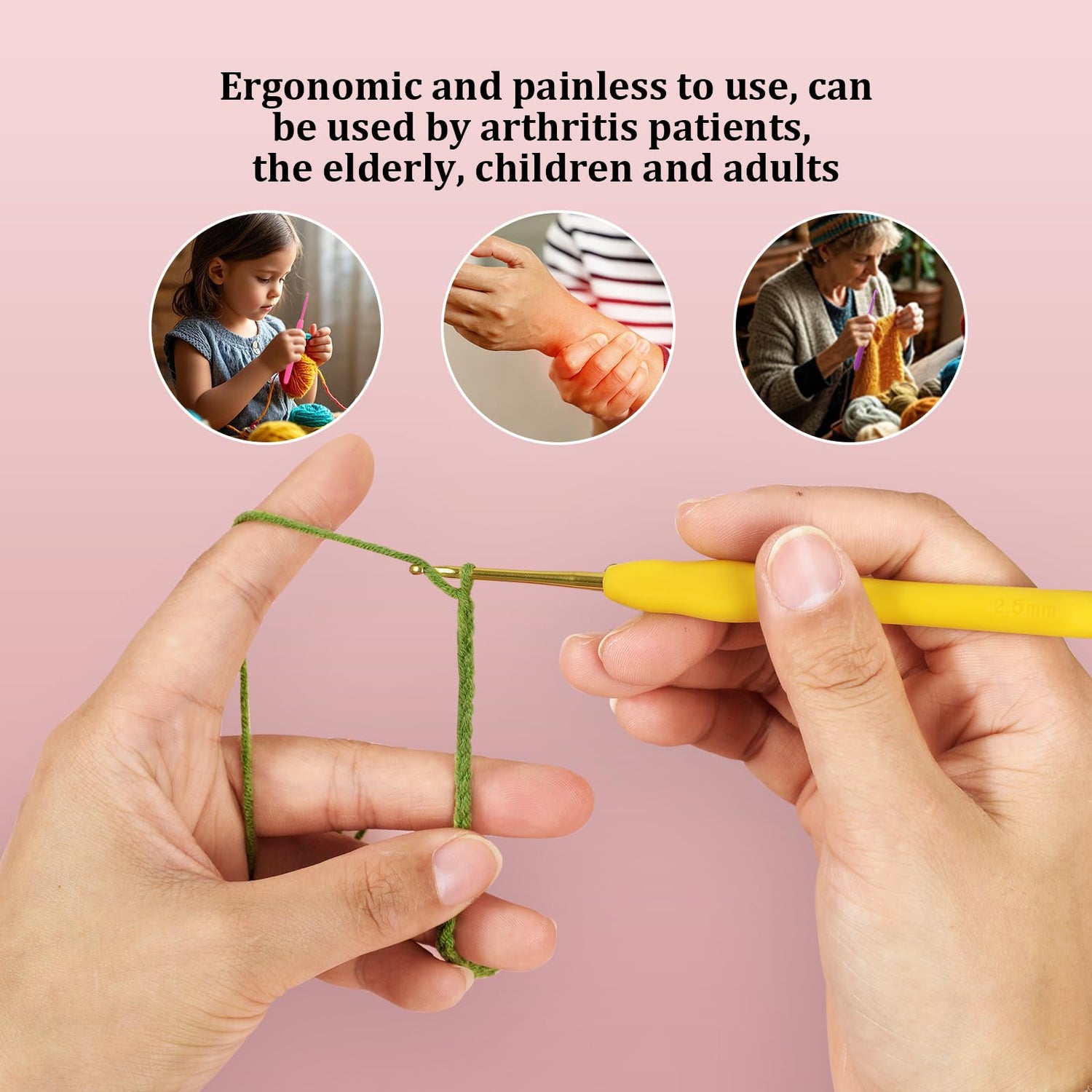 - LOOEN crochet hook set, has ergonomic soft grip handles, perfect for gripping. Made of durable rubber material, our crochet hook handles are well made and reinforced to avoid wrist pain during crocheting while providing a good grip. Enjoy your crochet projects more with an ergonomic crochet hook set.