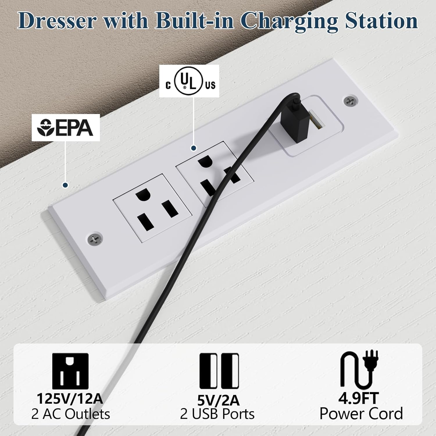 - 【Convenient USB Charging Station at Your Fingertips】Loomie 58" Dresser features 2 AC outlets and 2 USB ports, allowing you to charge your phone, tablet, and even plug in additional devices like lamps or speakers—all without leaving your bedside or workspace. No more searching for an outlet or dealing with messy extension cords. With its built-in charging station, this Loomie dresser keeps your devices organized and charged, giving you a seamless, clutter-free experience every time you walk into your room. Whether it's keeping your phone ready for the day or powering your nighttime essentials, you'll love how much easier this feature makes your everyday routine.