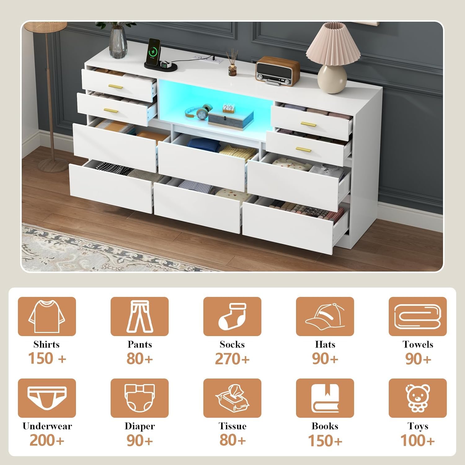 - 【Efficient Storage Solution】With 10 generously sized drawers, this 58" Dresser helps you stay organized by providing ample space for your wardrobe, personal items, and even bedding. The smooth-glide drawers and open cubbies allow you to access your essentials with ease. Each divided drawer is designed to keep everything from bulky sweaters to delicate accessories neatly arranged. The spacious dresser top is ideal for accommodating a variety of items or doubling as a TV stand,perfect for TVs up to 60 inches. You can also use it to showcase or store frames, vases or other decor, adding both functionality and style to your space such as bedroom, closet, hallway, or living room.