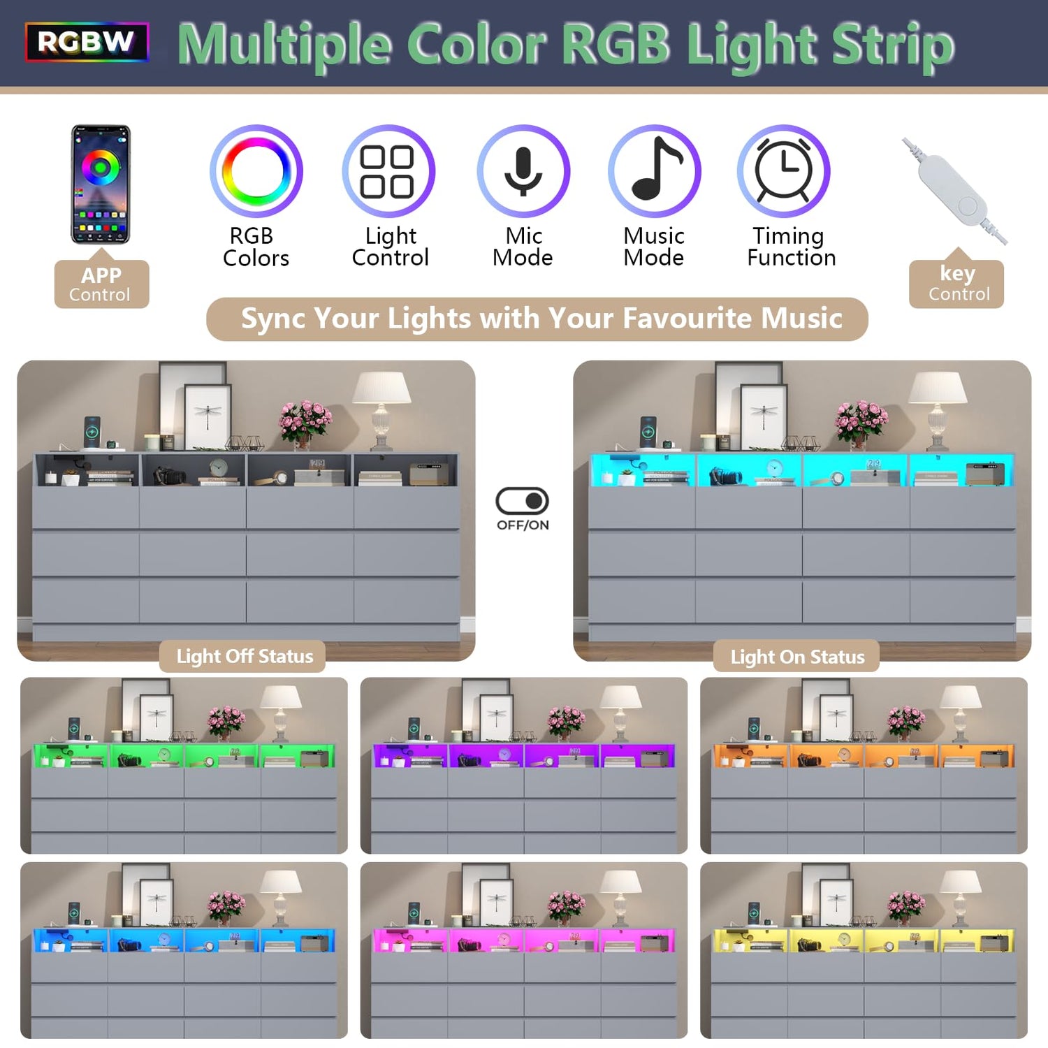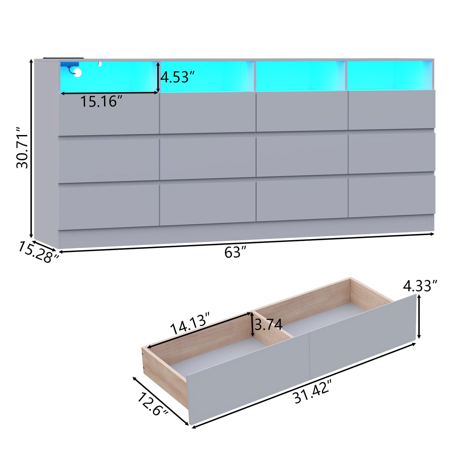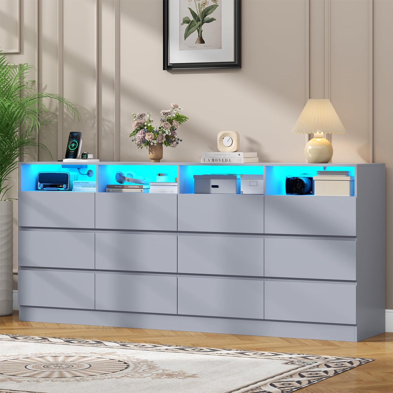 Loomie 12-Cell Divided Drawers Grey Dresser with Charging Station & Led Lights for Bedroom, Long 63" Wide Dresser TV Stand for TVs up to 75", Large Dressers Organizer with 4 Open Cubbies