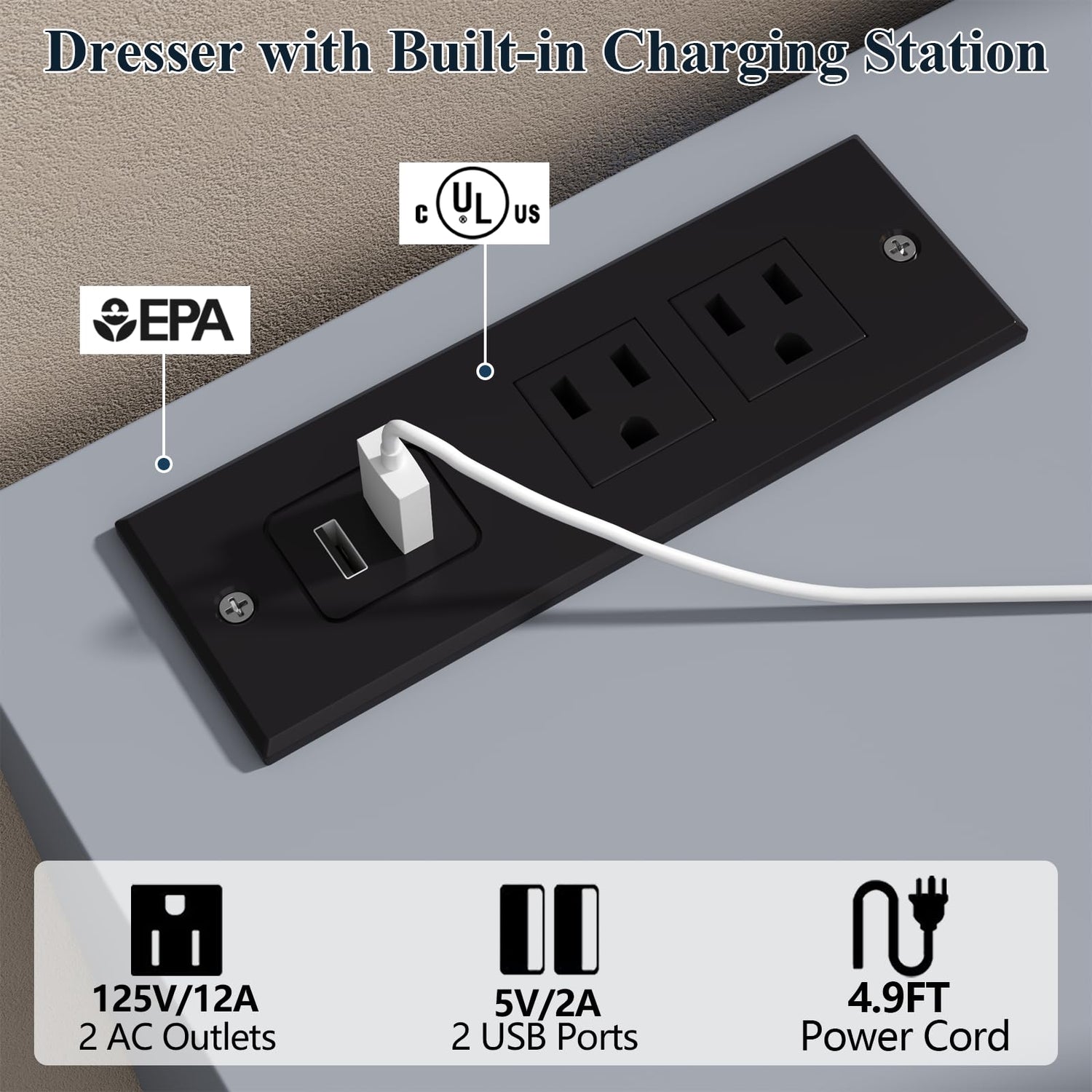 - 【Convenient USB Charging Station at Your Fingertips】Loomie 63" Dresser features 2 AC outlets and 2 USB ports, allowing you to charge your phone, tablet, and even plug in additional devices like lamps or speakers—all without leaving your bedside or workspace. No more searching for an outlet or dealing with messy extension cords. With its built-in charging station, this Loomie dresser keeps your devices organized and charged, giving you a seamless, clutter-free experience every time you walk into your room. Whether it's keeping your phone ready for the day or powering your nighttime essentials, you'll love how much easier this feature makes your everyday routine.