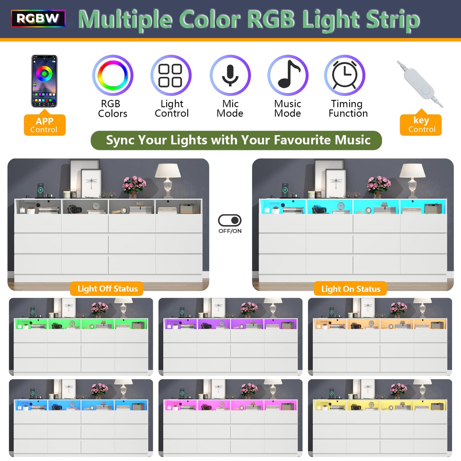 Loomie 12 Drawer White Dresser with Charging Station & Led Lights for Bedroom, Long 63" Quadruple Wide Dresser TV Stand for TVs up to 75", Large Dressers Organizer with 4 Open Cubbies for Living Room