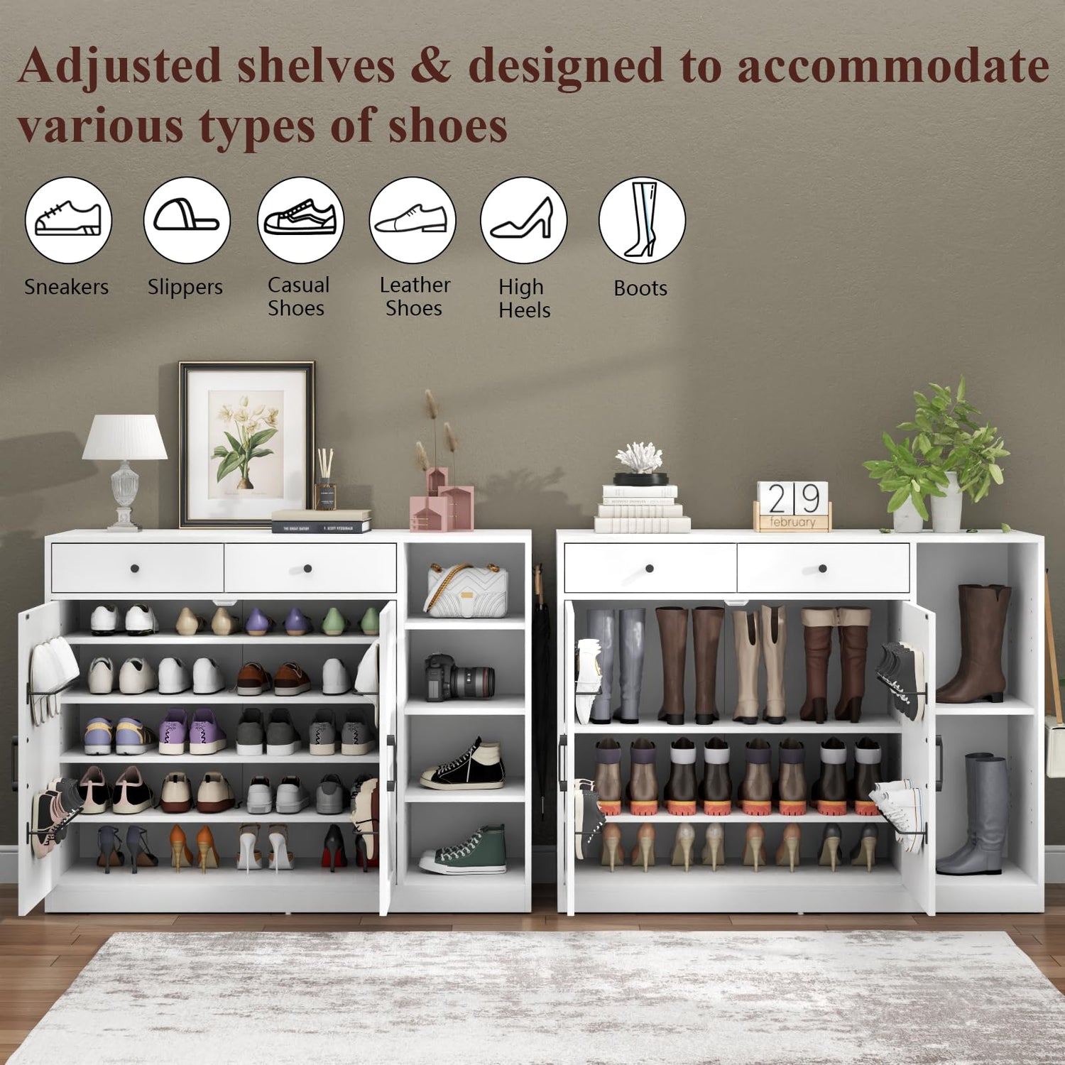 - [Large Capacity Shoe storage cabinet] This Shoe Cabinet can store 28-36 pairs of shoes (note: the number of pairs may vary depending on the size of the shoes).6 shelves can be adjusted in 2 grooves or removed to accommodate different heights and sizes of flats, mid-boots, or heels.The spacious top surface and 2 top drawers are perfect for accessories, keys, wallets, etc., and make it easier for you to access items.Two side hooks can be used to hang bags or umbrellas, and four brackets inside the cabinet door can be used to clip items like slippers.