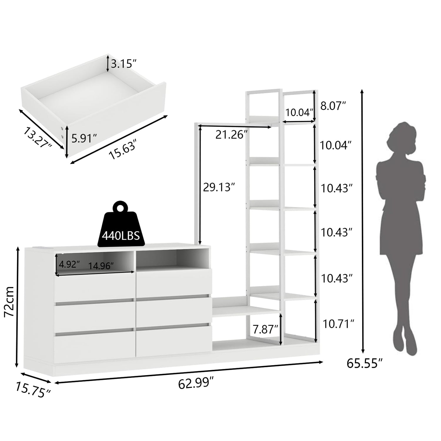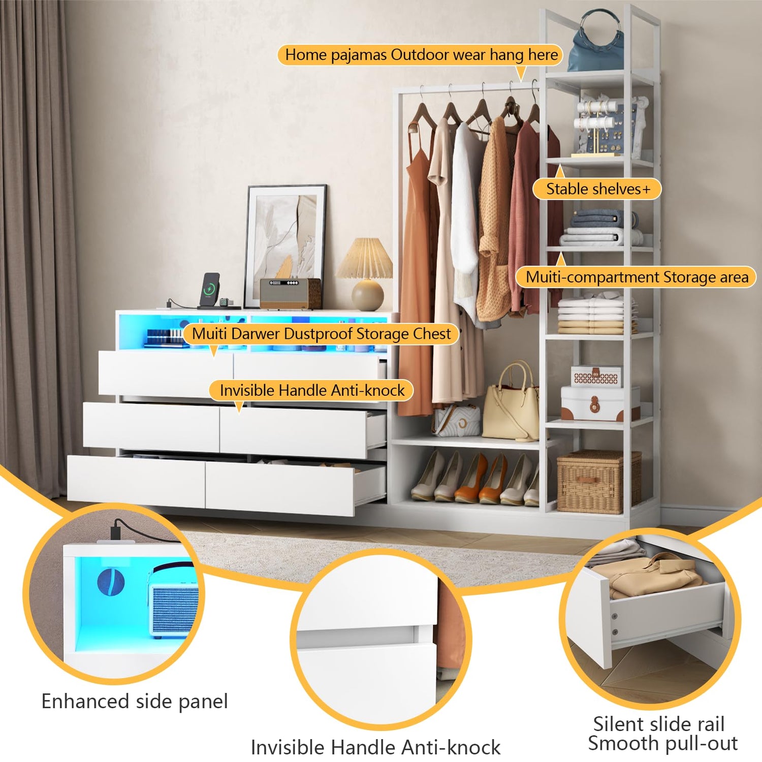 Loomie 6 Drawers Dresser with Hanging Rack & 6 Tiers Shelves, LED Dressers & Chests of Drawers with Power Outlet, 63" Wide Long 4 in 1 Storage Unit Dressers, Closet Dresser for Bedroom (White)