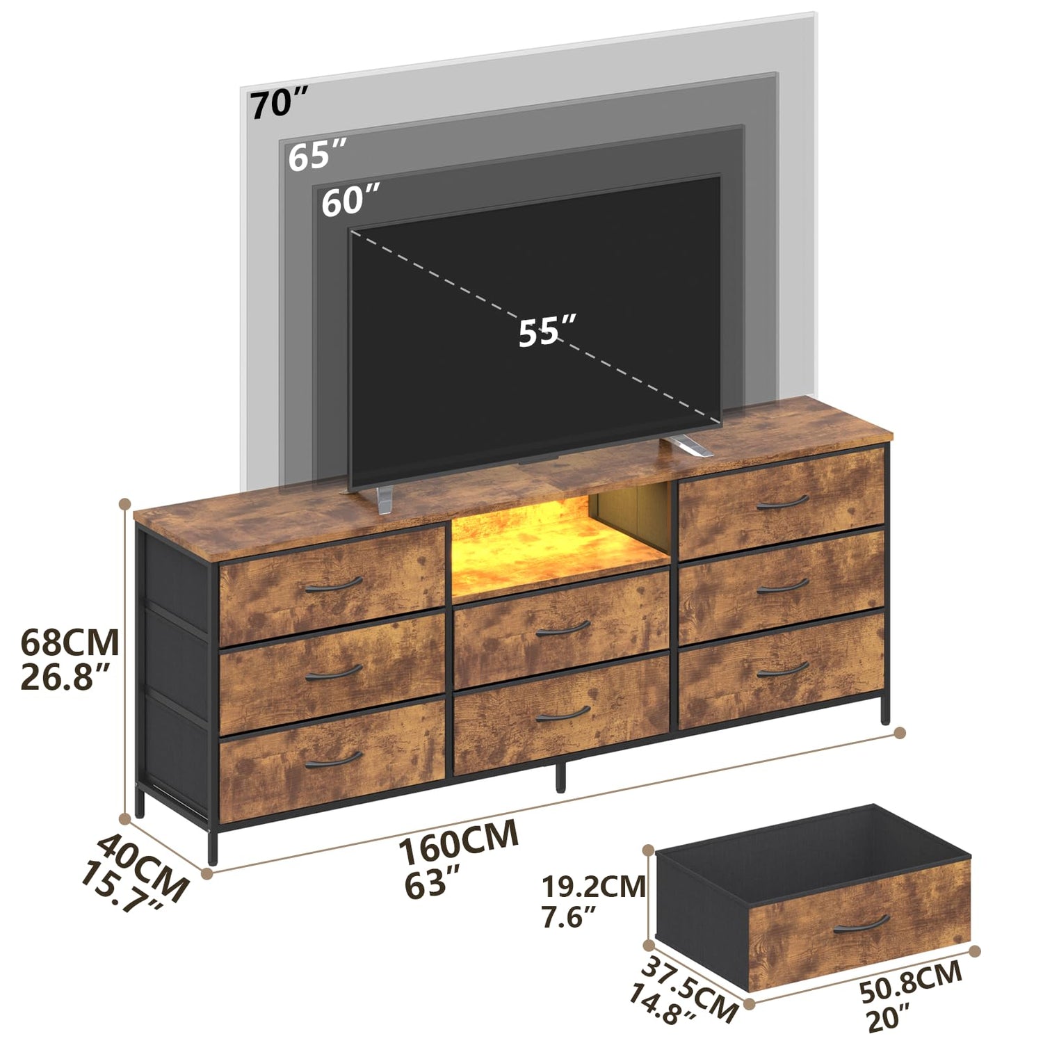 Loomie 63 Inch Dresser for Bedroom, Wide Long Fabric Dresser with LED Lights & 8 Drawers, Large TV Stand for 55, 65, 70 Inch TV, Entertainment Center with Storage (Rustic Brown)