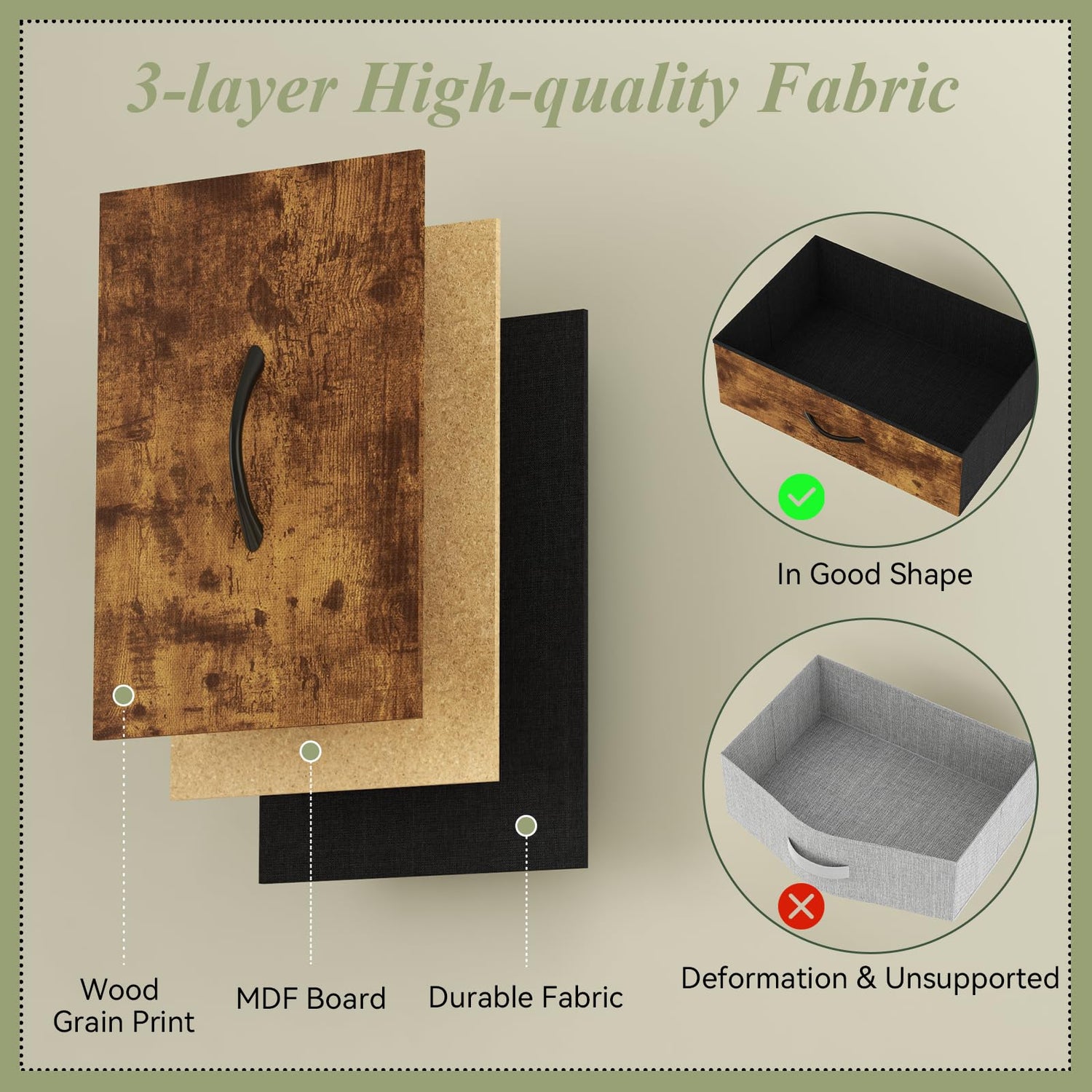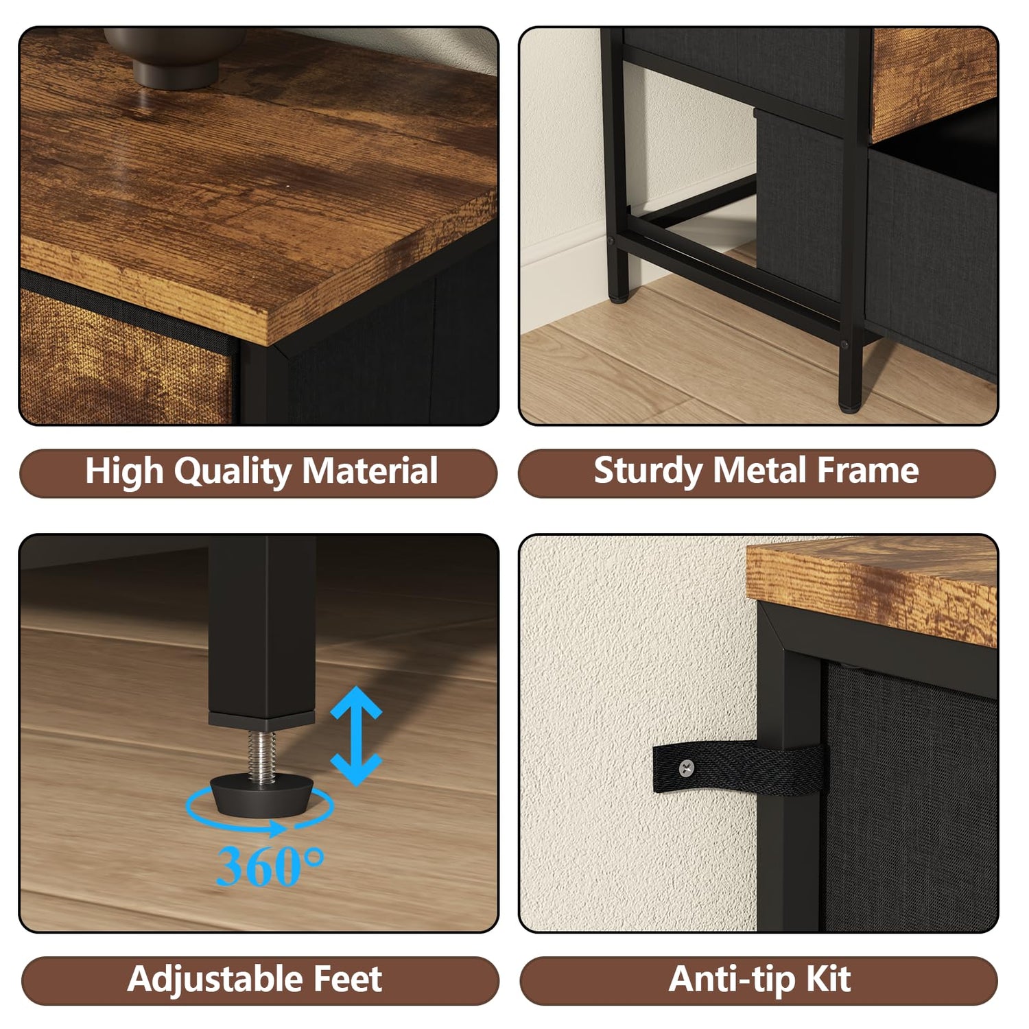 - 【Sturdy & Durable Structure】Constructed from high-quality fabrics, durable engineered wood and sturdy metal frame, this bedroom dresser provides excellent stability and reliable support, ensuring long-lasting durability. Drawers slide smoothly and can hold up to 44 pounds per drawer. The 6 adjustable feet on the bottom keep it stable on uneven surfaces and protect your floor from scratches. The dresser also comes with an anti-tip kit, which you can install on the wall for added stability.