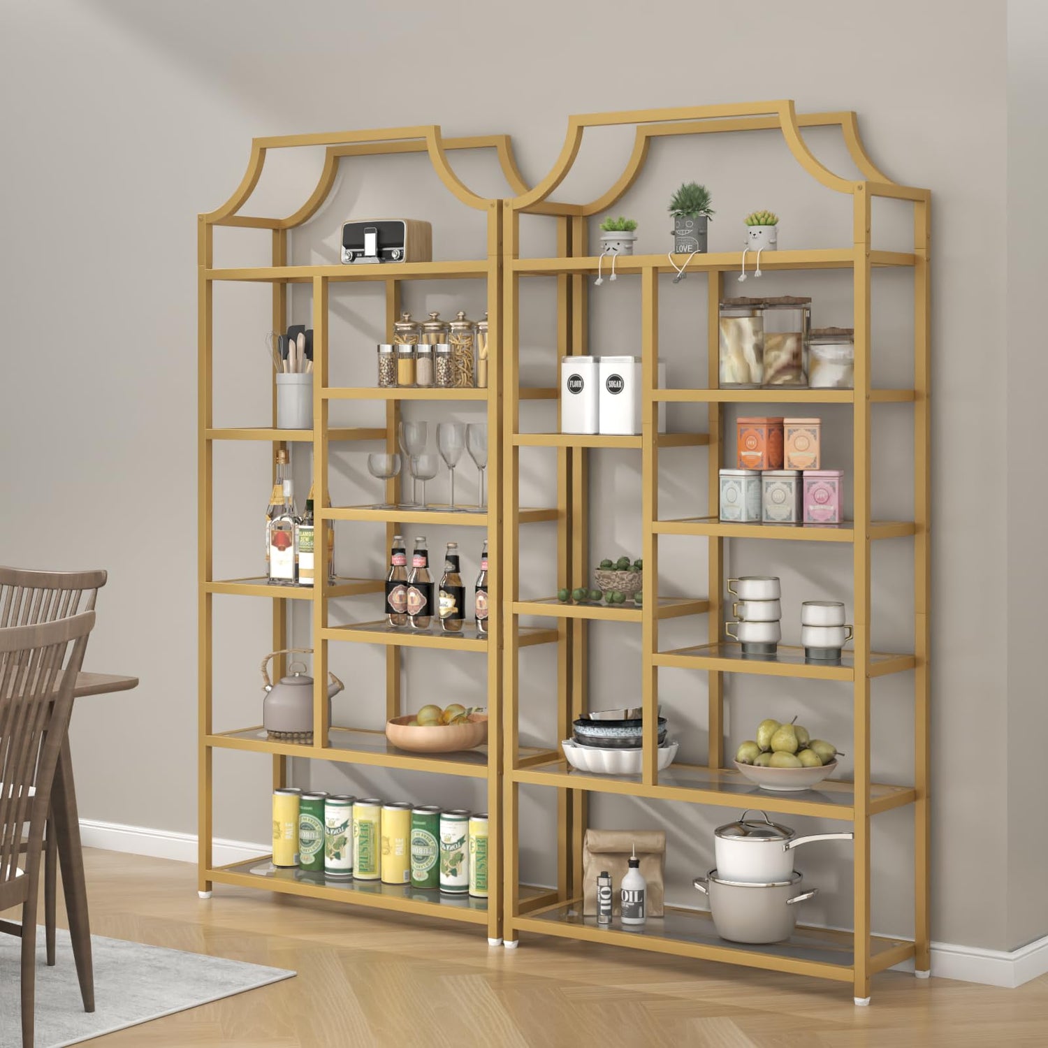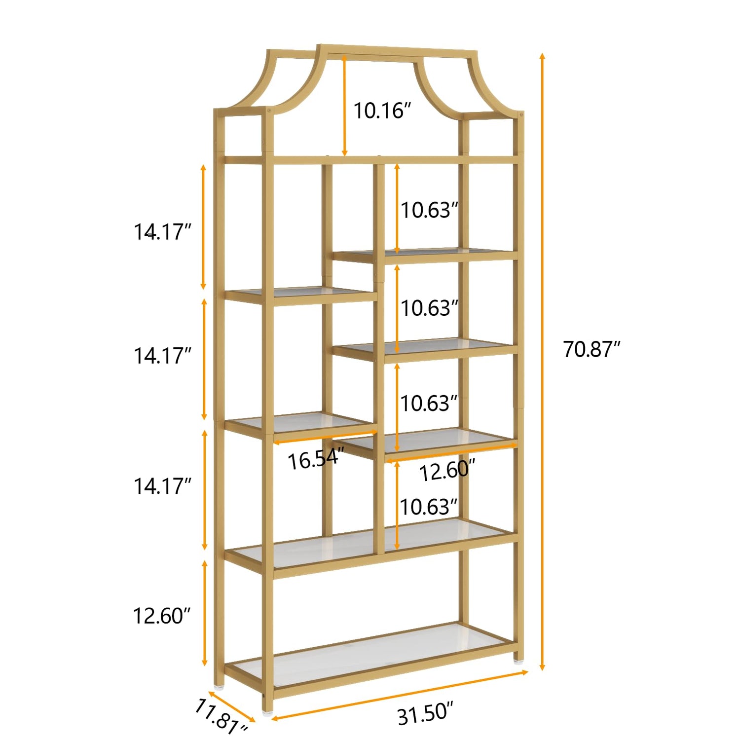 - 【Staggered & Ample Display Space】 Assembly Dimensions are 70.87”H* 11.81”W*31.5”L. Loomie etagere bookshelves features eight staggered open tempered glass shelves. Books, vases, candles, statuettes... All your prized possessions will instantly be showcased with this contemporary shelving unit. Its gold colour, authentic and refined makes no style faux pas. With its chic, minimalist look, This sleek and elegant etagere adds classic beauty to any room and will have you living in the lap of luxury.