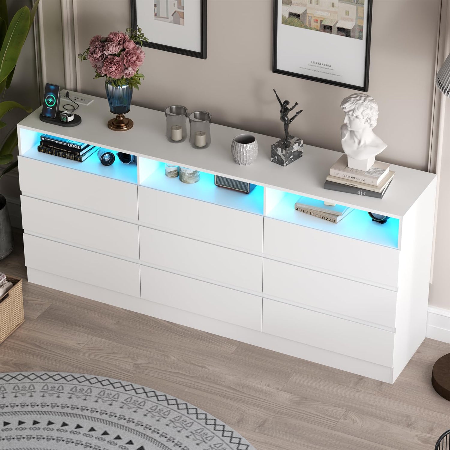 Loomie 9 Drawer Dresser with Power Outlet, Modern Chest of Drawers with LED Light, Long Wide Drawer Dresser Organizer Cabinet with 3 Open Cubbies for Bedroom, Living Room,Entryway (White)