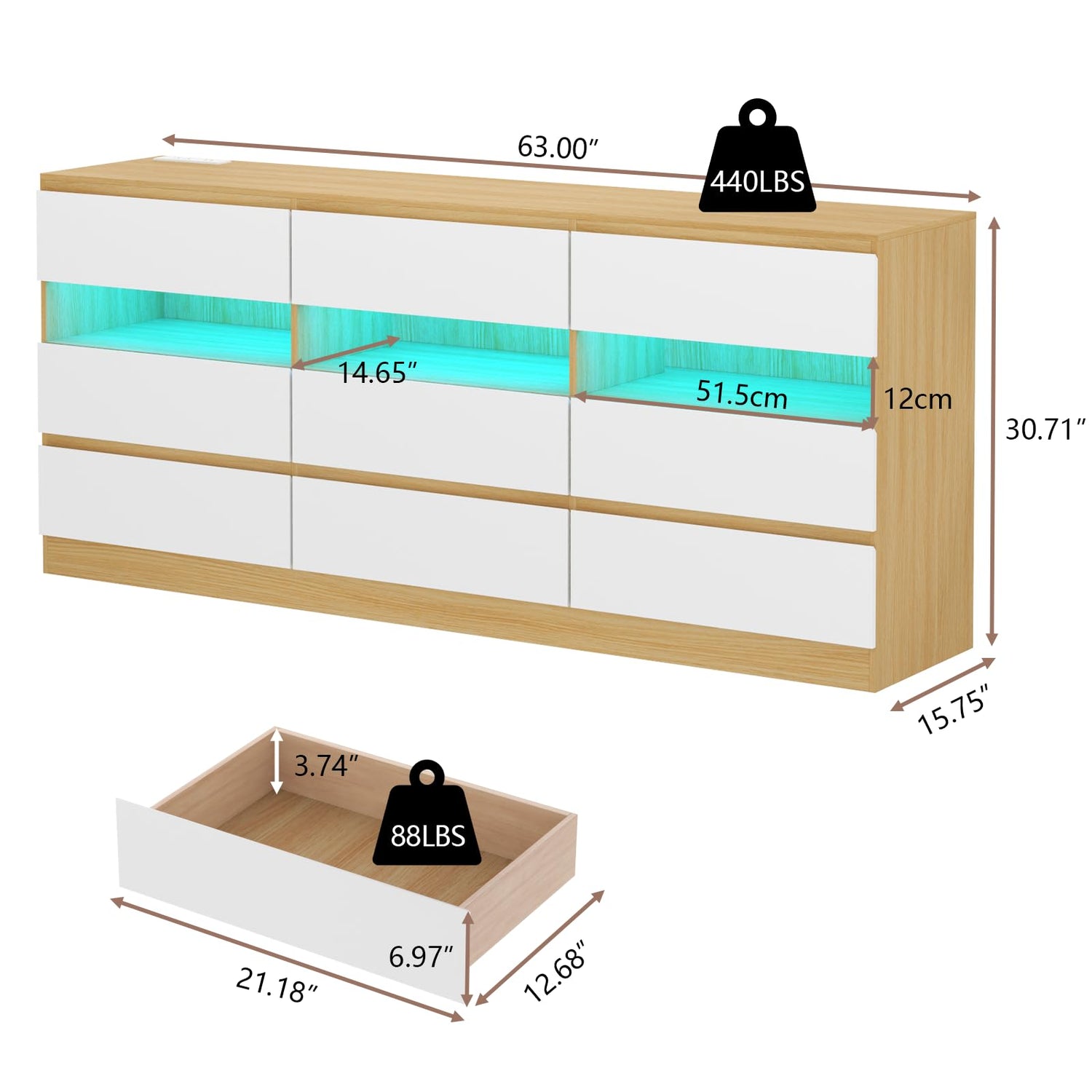 Loomie 9 Drawer Triple Dresser with Charging Station & Led Lights for Bedroom,Long 63" Dresser TV Stand for TVs up to 75",Wide Large Drawer Dressers Organizer with 3 Cubbies for Hallway, Light Wood