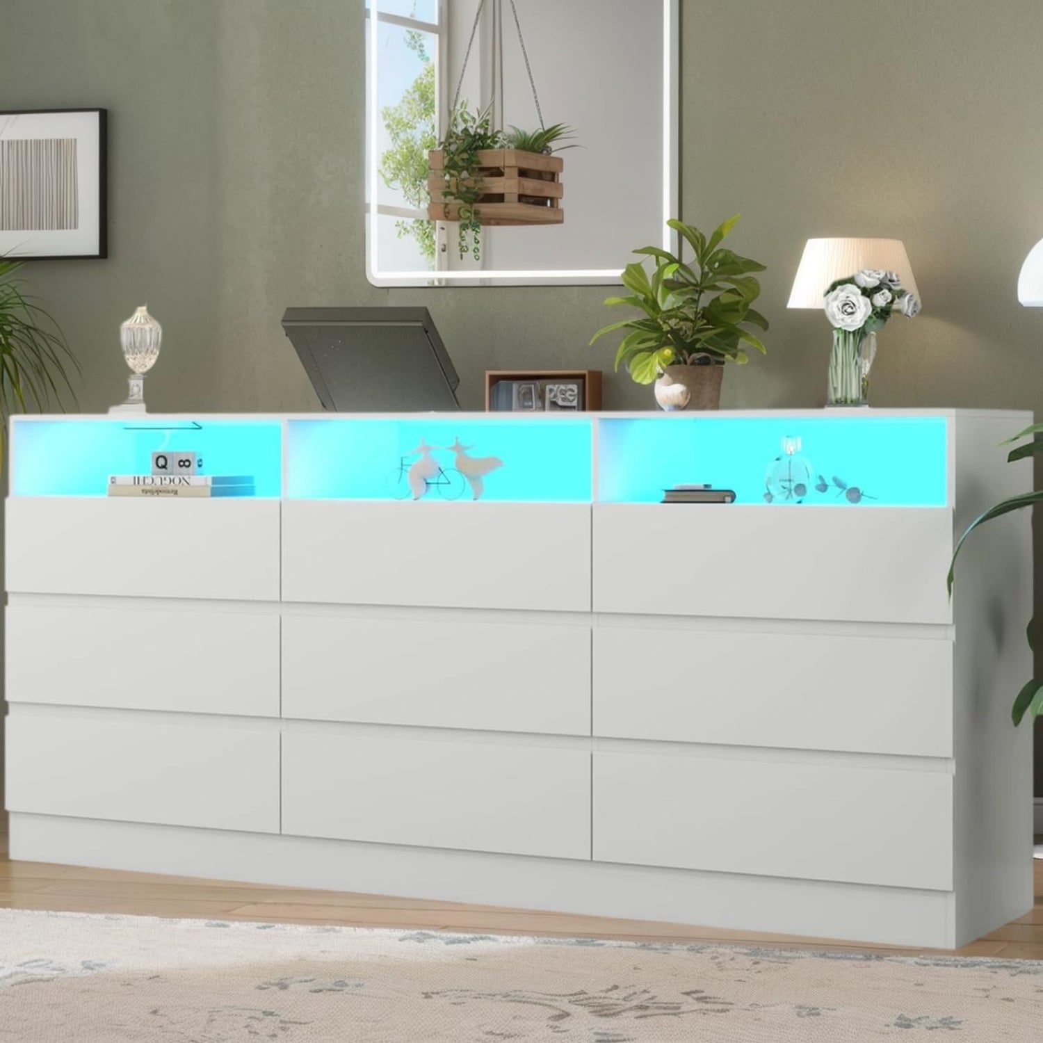 Loomie 9 Drawer White Dresser with Charging Station & Led Lights for Bedroom, Long 63" Triple Wide Dresser TV Stand for TVs up to 75", Large Dressers Organizer with 3 Open Cubbies