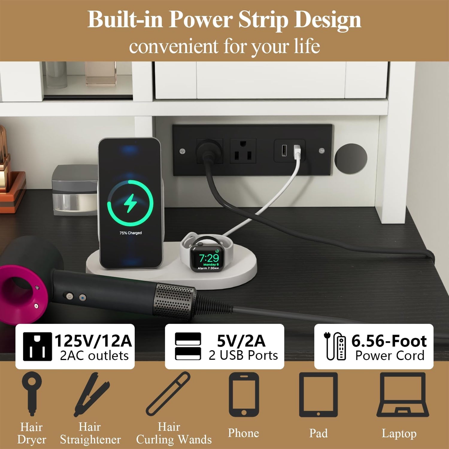 - 【Convenient Charging Station】This makeup vanity table comes with a built-in charging station that includes 2 AC outlets and 2 USB ports for seamless charging of hair dryers, curling irons, personal care devices and smart devices. So whether you're applying makeup, blow drying your hair, or charging your phone, you can do it all from your vanity.