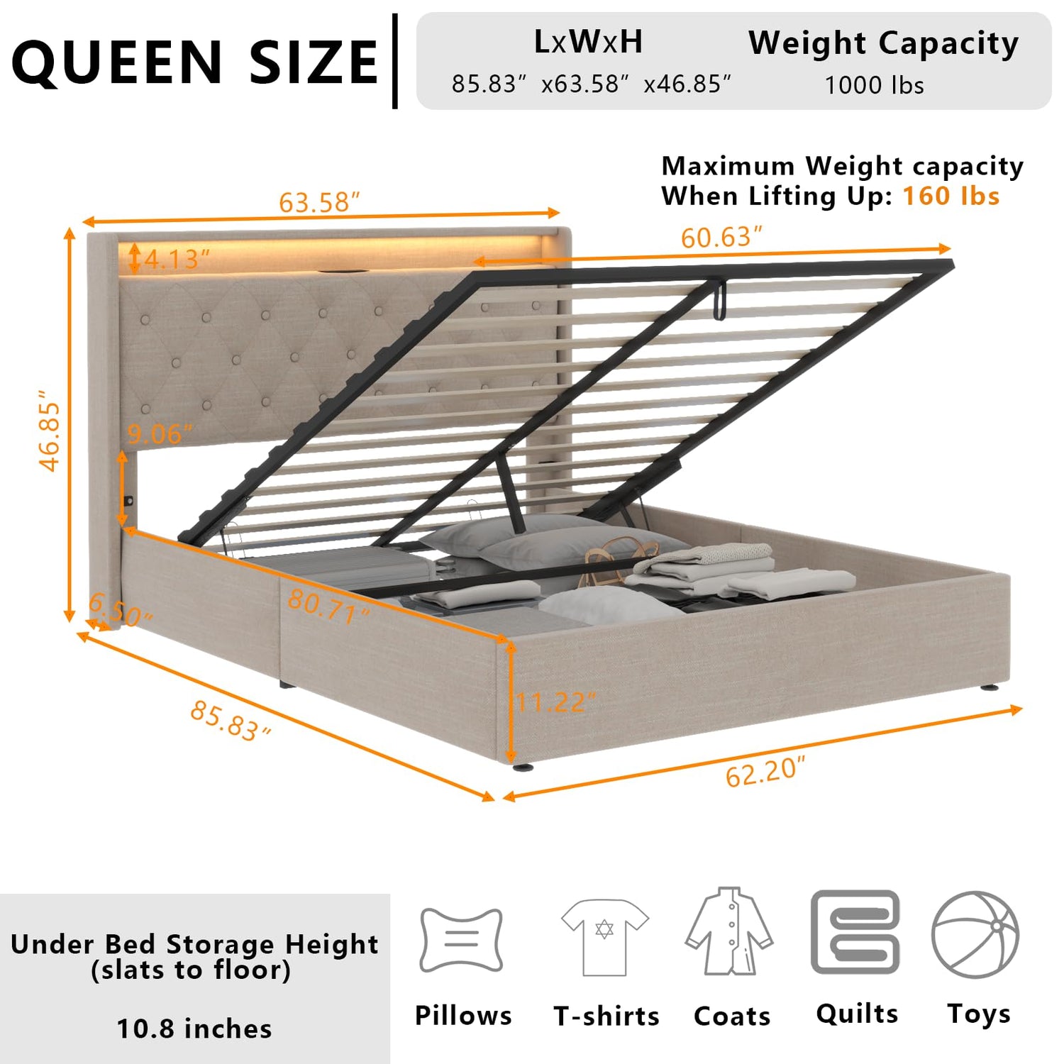 Loomie Upholstered Queen Bed Frame with Lift-Up Storage, LED Lights & Charging Station in Beige
