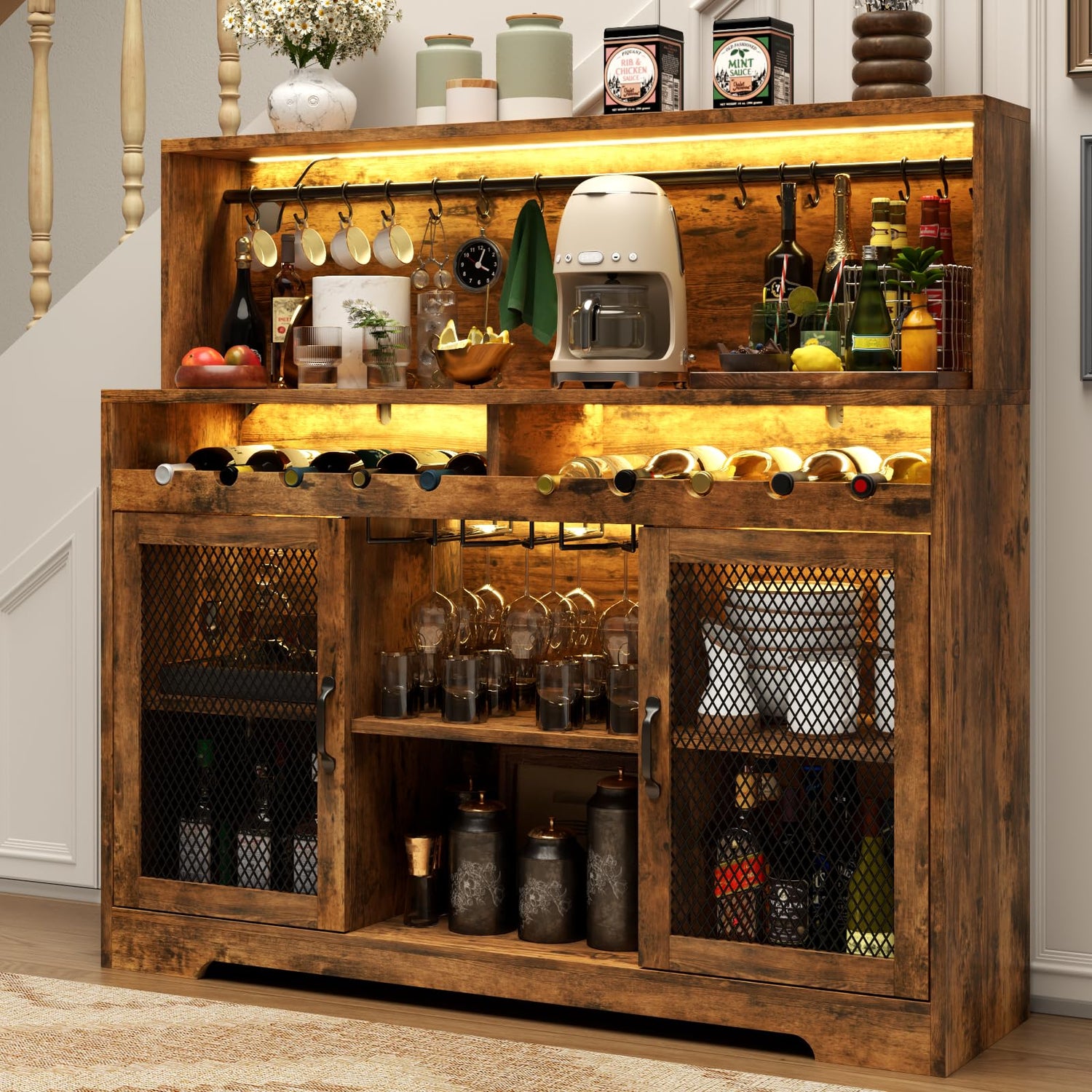 Loomie Wine Bar Cabinet with LED Light, Liquor Cabinet with Glass Holder, Coffee Bar Cabinet for Liquor, Storage Buffet Cabinet with Wine Racks, Wine Cabinet with Mesh Door (Rustic)