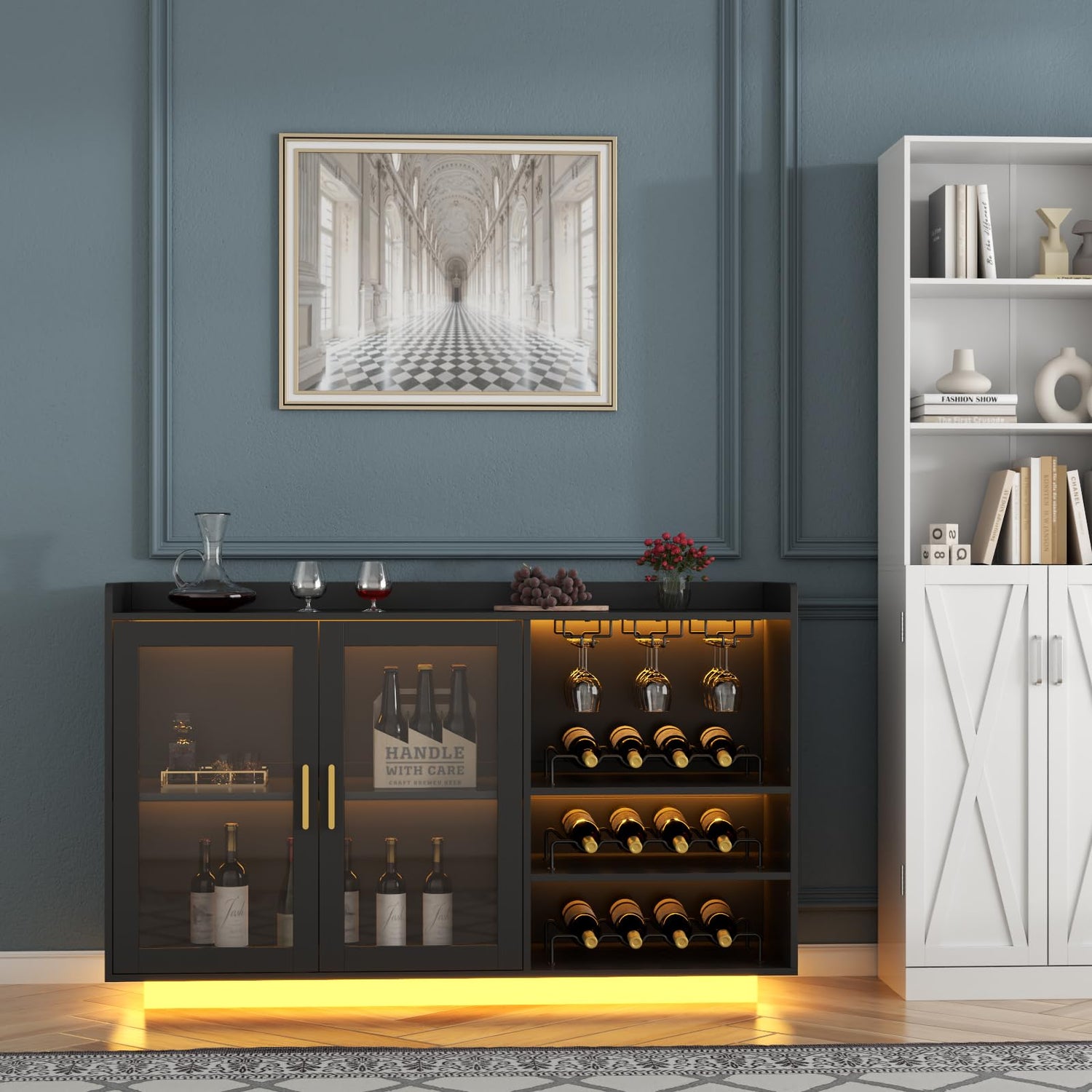 - 【Multi-function Home Bar Furniture】The Loomie wine bar cabinet is an ideal blend of sophistication and function. Let it stand out in the dining room as a sideboard to showcase your best serve ware, keeping your favorite bottles of wine glassware, and bar accessories in this handsome cabinet, while still have plenty of tabletop space to prepare drinks and appetizers. All-in-one design combines a LED light, visually floating, wine glass rack, wine rack, storage shelves and cabinet. You can use it as a coffee bar or microwave stand, kitchen sideboard, buffet cabinet and bakers cabinet, making the most of your living space. It is a perfect addition for your kitchen or dining room.