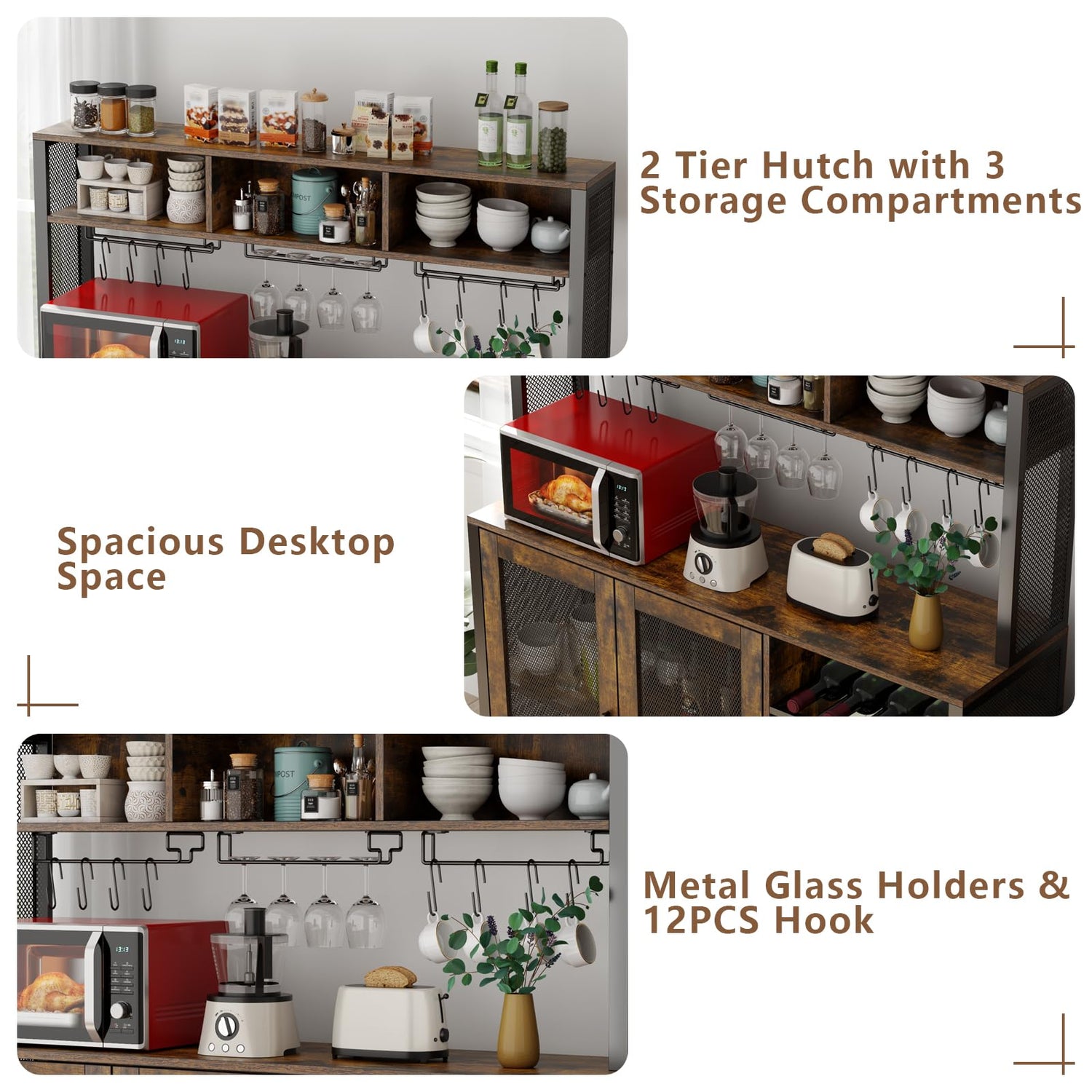 - 【Ample Storage Space】The powerful storage capacity of this wine bar cabinet ensures that everything you need is organized. There are 3 storage compartments on top and 3 Metal Glass Holders and 12 hooks attached below to keep your wine glasses and mugs safe and within reach. The mesh door cabinet with adjustable shelf provides enclosed storage for your dishes, canned goods, snacks and liquor. On the right side of the storage cabinet is the 2-Tier wine bottle storage rack with an open space underneath for more bottles and glassware. The spacious tabletop provides plenty of room for a coffee maker, microwave, toaster, and other items.