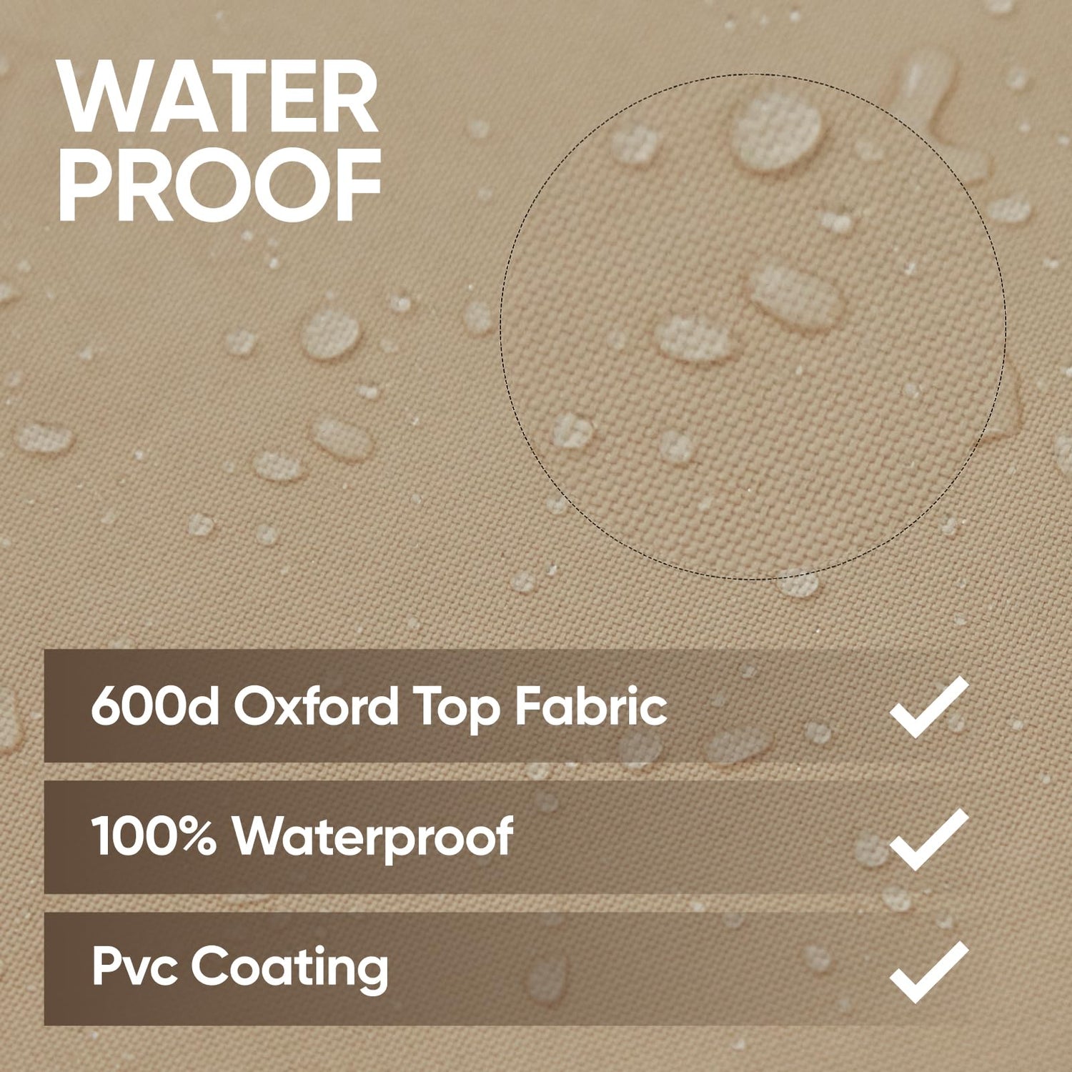 - WATERPROOF: Heavy duty 100% 600D Oxford water-resistant top fabric with added UV-stabilized coating and waterproof undercoating is made to protect your patio furniture cover from natural damage and outdoor elements like sun, dirt, rain, snow.