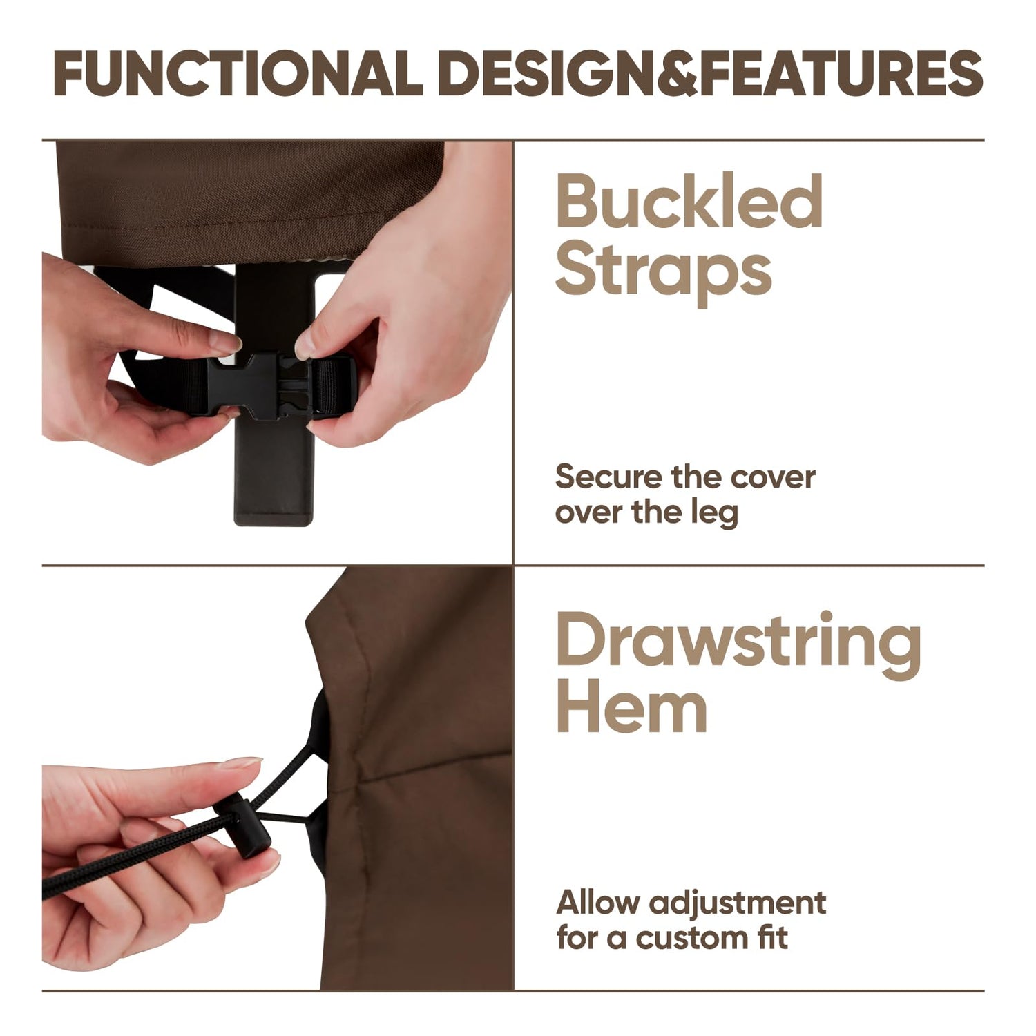 - WINDPROOF: The elastic hem cord with adjustable toggle allows you to make a tight custom fit on the bottom of the furniture covers. Buckled straps over legs provide extraordinary security on the windiest days.