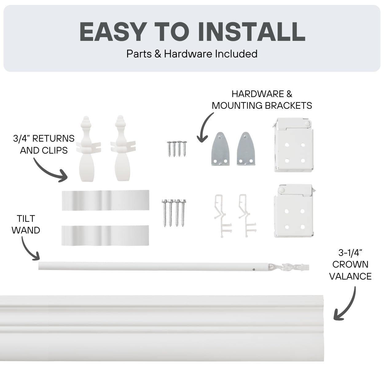 - Easy to Install & User Friendly: Faux Wood Blinds offer style and privacy, ideal for different room types such as living rooms, bedrooms, dens, and kitchens. They come complete with hardware and installation instructions for both inside and outside mounting. Each blind includes a 3 1/4" crown valance to provide the appearance of real wood blinds.